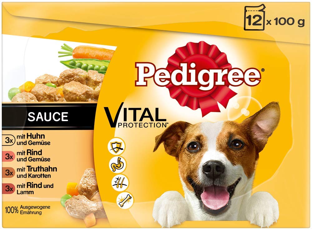 Freshly portioned in a pouch, our Pedigree wet food is a real treat. In the multipack, you will receive four delicious varieties: with chicken and vegetables, with beef and vegetables, with turkey and carrots, and with beef and lamb in gravy. The coordinated ratio of meat, vitamins, and fiber guarantees a balanced diet. Naturally free of added sugar, artificial flavors, colors, and preservatives. Good and delicious. The practical and easily portioned Pedigree pouches are perfect in addition to the main meal as a mealtime treat and as a supplement to dry food. Vital Protection With our Pedigree wet products, you support your dog in its daily needs. Our products contain natural fiber to promote healthy digestion, calcium to support healthy bones, zinc and sunflower oil with omega 6 for a shiny coat, and vitamin E to support the immune system.No artificial flavors. No added sugar. Delicious wet food for adult dogs. Fraîchement dans un sachet de portions, notre nourriture humide Pedigree est un vrai plaisir. Dans le multipack, vous recevrez quatre délicieuses variétés : au poulet et aux légumes, avec du bœuf et des légumes, avec de la dinde et des carottes et avec du bœuf et de l'agneau en sauce. Le ratio coordonné de viande, de vitamines et de fibres garantit une alimentation équilibrée. Naturellement sans sucre ajouté, arômes artificiels, colorants et conservateurs. Bon et délicieux. Les sachets Pedigree pratiques et facilement portionnables sont parfaits en plus du repas principal comme friandise pour les repas et en complément de la nourriture sèche. Vital Protection Avec nos produits humides Pedigree, vous soutenez votre chien dans ses besoins quotidiens. Nos produits contiennent des fibres naturelles pour favoriser une digestion saine, du calcium pour soutenir des os sains, du zinc et de l'huile de tournesol avec des oméga 6 pour un pelage brillant, ainsi que de la vitamine E pour soutenir le système immunitaire.Sans arômes artificiels. Sans sucre ajouté. Délicieuse nourriture humide pour chiens adultes.