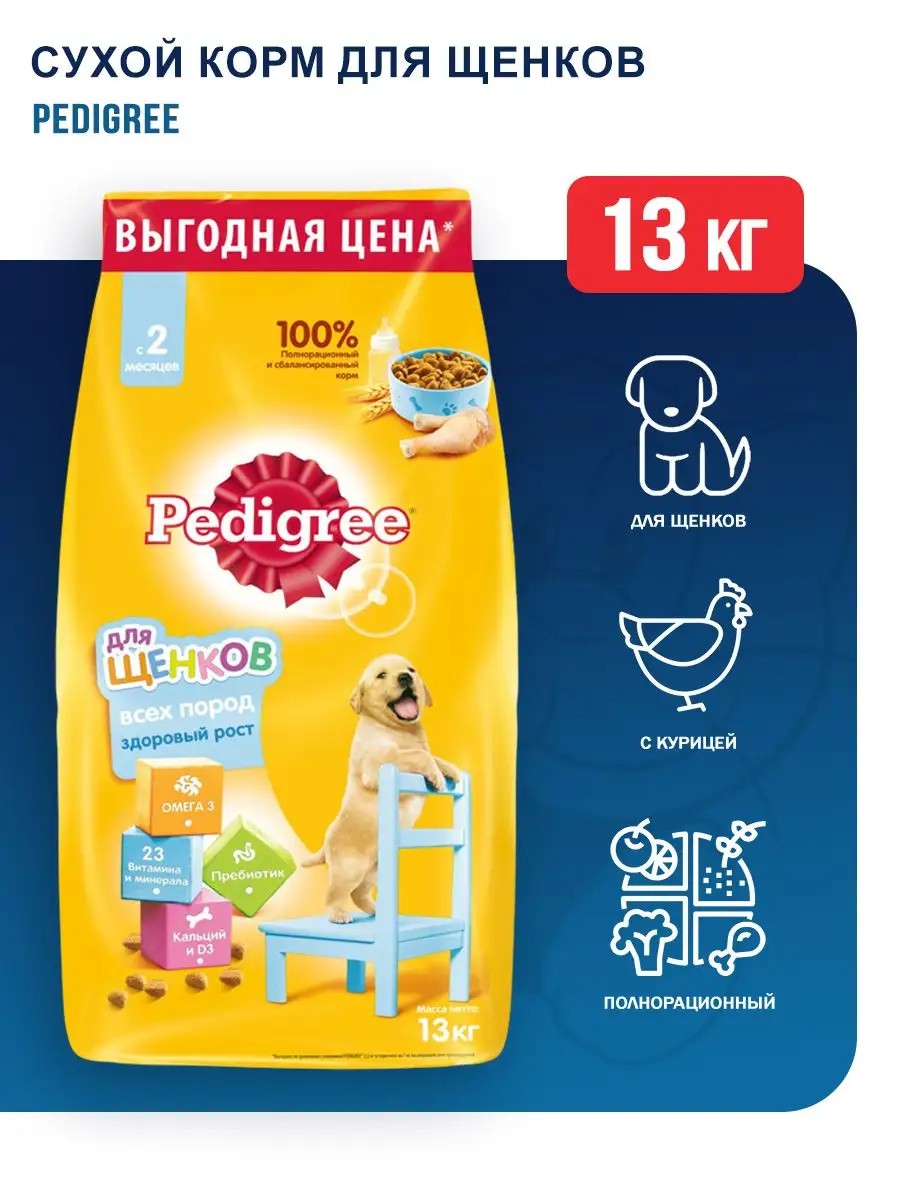 Pedigree сухой корм для щенков всех пород с 2 месяцев с курицей - 13 кг. Рацион PEDIGREE полнорационный корм с курицей создан с учетом потребностей щенков в период наиболее интенсивного роста. Он состоит из качественных и натуральных ингредиентов: мяса, овощей, злаков. Поэтому PEDIGREE полнорационный корм с курицей способствует здоровому росту и гармоничному развитию вашего малыша. Он также создан с учетом особенностей пищеварения самых маленьких, легко усваивается и обеспечивает правильную работу их желудочно-кишечного тракта. Ингредиенты: Мука из птицы (в том числе курица), пшеница, рис, свекольный жом, кукуруза, подсолнечное масло, жир животный, высушенные пивные дрожжи, минералы, витамины, рыбий жир, глюкозамин.