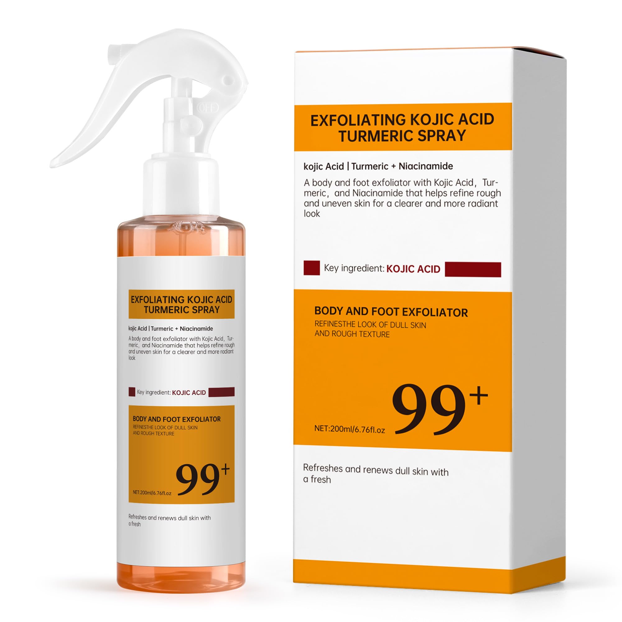 Name: Kojic Acid Turmeric Body Spray Net Content: 6.67 FL OZ (200 ml) Skin Type: All skin types Shelf Life: 3 Years Package Includes: 1 Pack x Peel Shot Keratin Care Kojic Acid Turmeric Spray