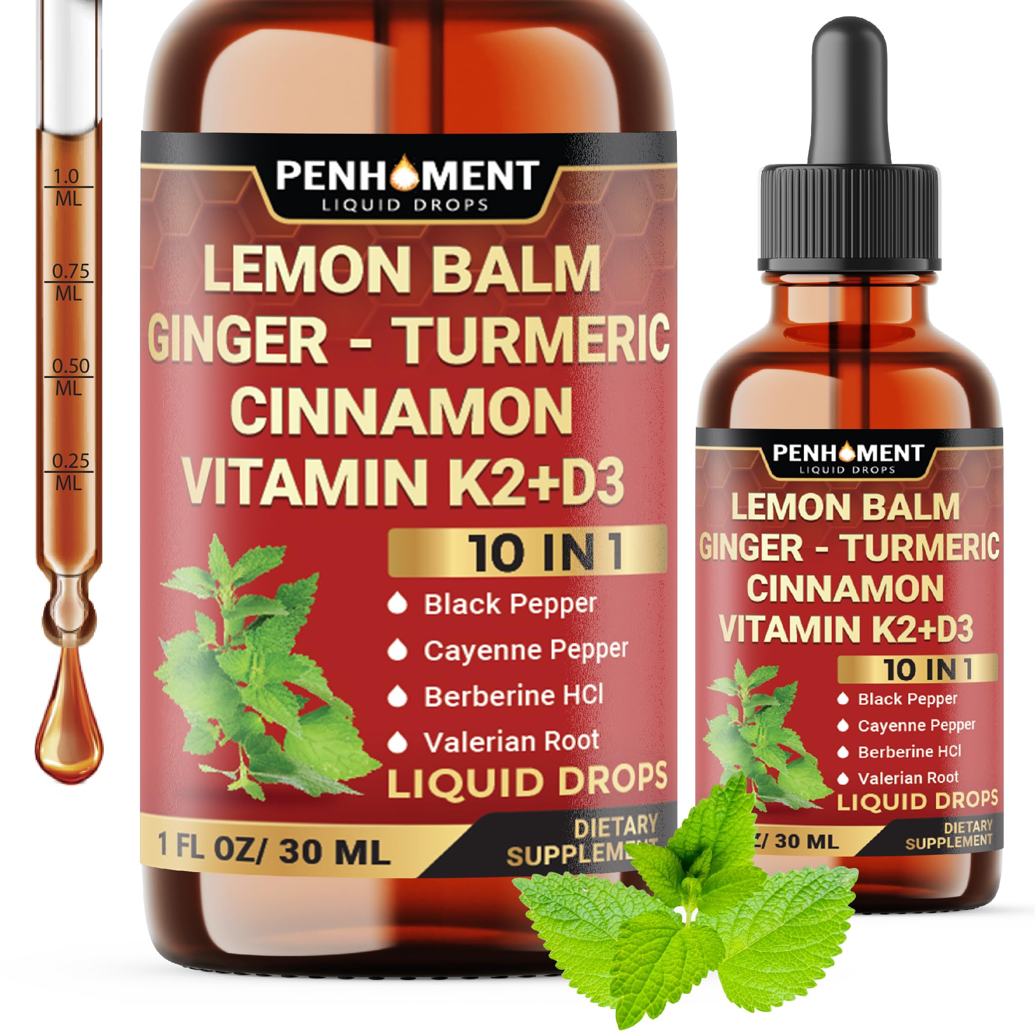 Penhoment 10in1 Lemon Balm Tincture with Ginger Root, Turmeric Liquid, Ceylon Cinnamon, Berberine, Black Pepper for Relaxation 3300mg - 1FL Oz - 60 Day Supply