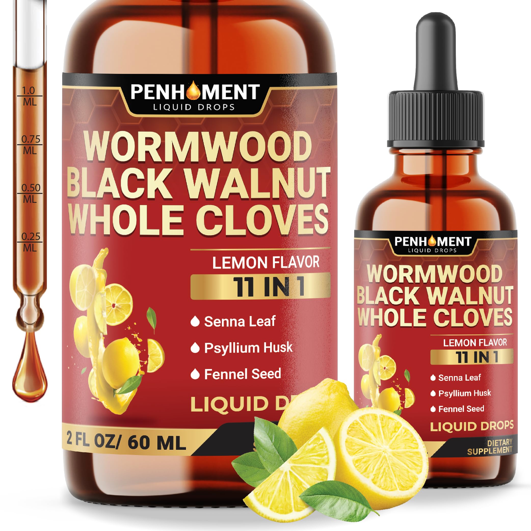Penhoment 11in1 Wormwood Liquid Drops with Black Walnut Cloves, Vitamin C and D3 & 6 More - 2 FL OZ for 60 Days - Lemon Flavor
