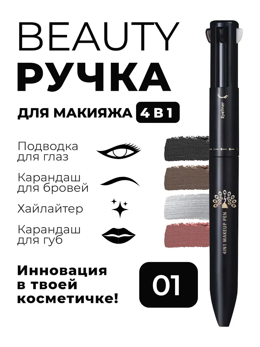 Ручка для макияжа 4 в 1 - это профессиональный набор косметических средств, объединенных в одном карандаше. Она содержит четыре функции. Карандаш для бровей. Черная подводка лайнер для глаз. Розовый нюдовый контур для губ. Нюд хайлайтер. Ручка-карандаш имеет выдвижной механизм и нажатием соответственной кнопки просто появляется необходимый инструмент, что делает ее очень практичной. Это недорогая и удобная в использовании косметика позволяет создавать различные виды make up - от естественного повседневного до вечернего образа. Мини стик всегда можно носить с собой, даже в кармане, чтобы быстро поправить мейк в любых условиях. Выкручивающиеся цветные стержни не требуют заточки. Кремовая текстура стерженьков не твердая и в меру мягкая, при этом водостойкая. Мейкап ручка может нарисовать тонкие или толстые стрелки век, прорисовать волоски на бровках, служить основой под губную помаду, а блестящий хайлайт обозначит четкий контуринг и выбелит нужные зоны. Цвет грифелей матовый, эффект для лица стойкий. Главным преимуществом, несомненно, является ее компактность. В одном футляре находится половина женской косметички. Инновационная beauty ручка-стик поместится в самой маленькой сумочке, что особенно важно, например, на торжественных мероприятиях. Автоматический лайнер идеален для тех, кто хочет все и в одном месте. Ручка-косметичка станет незаменимой подружкой для любой девушки, которая следит за своей красотой. А еще это отличный подарок для вашей мамы, подруги или дочки подростка.