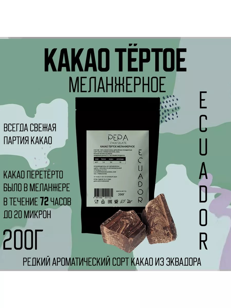 Какао тертое меланжерное, из какао-бобов ароматического эквадорского сорта Arriba Nacional. Данный сорт какао отличает благородный шоколадный вкус с легкими пряными нотами в аромате. Сбалансированное сочетание кислинки горчинки и терпкости, мягкость аромата и умеренная насыщенность вкуса. Данное какао тертое в отличии от фабричного получают перетиранием какао крупки каменными жерновами, в меланжере, в течении 72 часов. Также в какао тертом не было отжато часть какао масло, в качестве снижения себестоимости.