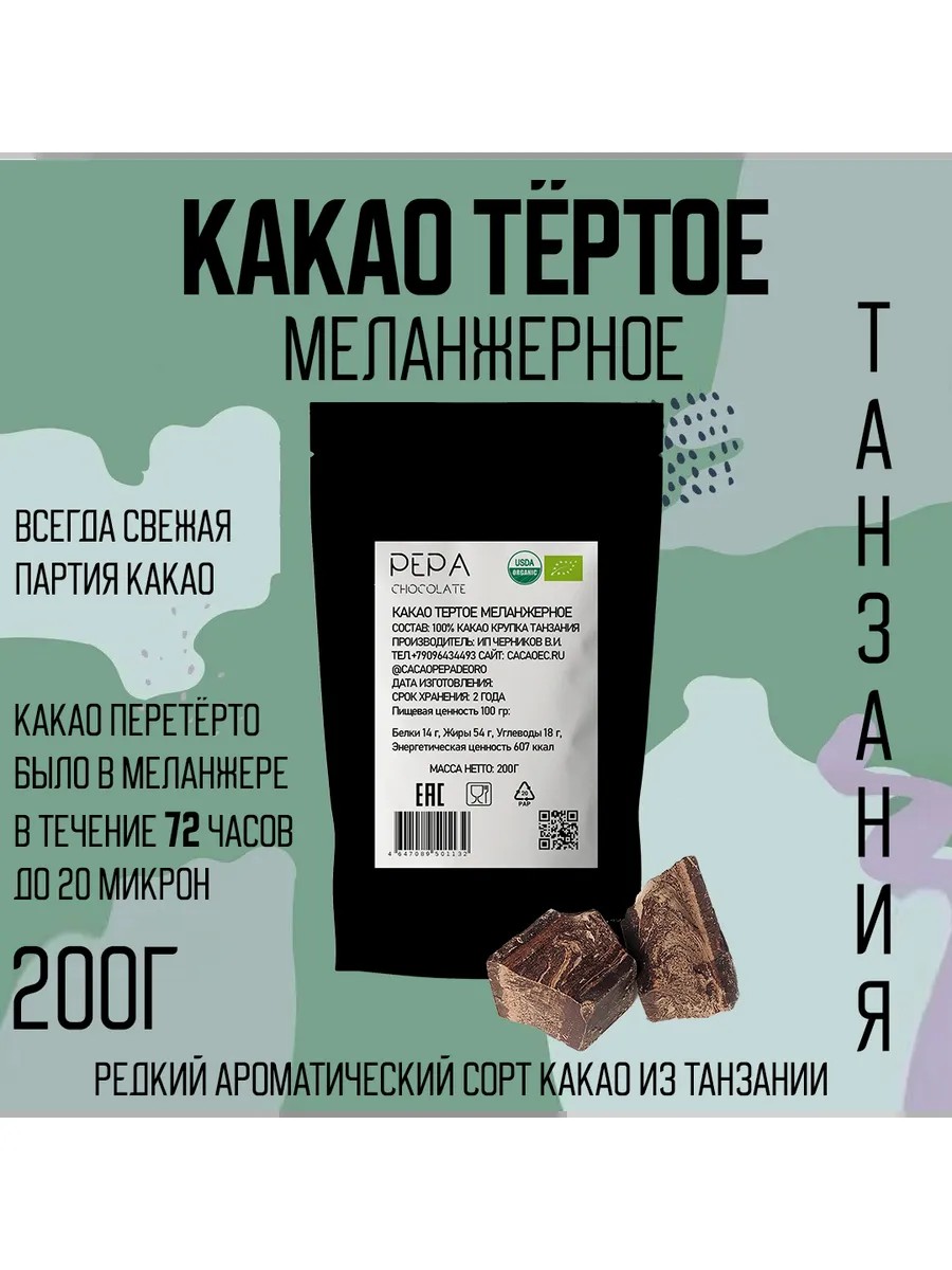 Какао тертое меланжерное, премиум качества, произведенное из перебранных вручную какао-бобов из Танзании сорта Кокоа Камили, категории Fino de Aroma. Вкусо-ароматический профиль состоит из красных фруктов (вишня, слива), цветочных и ореховых нот. Сбалансированное сочетание кислинки горчинки и терпкости, мягкость аромата и умеренная насыщенность вкуса. Данное какао тертое в отличии от фабричного получают перетиранием какао крупки каменными жерновами, в меланжере, в течении 72 часов.