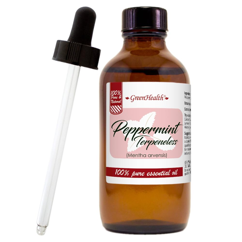 GREENHEALTH PEPPERMINT ESSENTIAL OIL (TERPENELESS) – 4 FL OZ 100 Pure Uncut Amber Glass Bottle with Glass Dropper Experience the invigorating power of GreenHealth Peppermint Essential Oil (Terpeneless), a premium-grade essential oil carefully processed to remove terpenes while preserving its crisp, cooling aroma. This 100 pure and uncut peppermint oil delivers a refreshing scent and versatile benefits for aromatherapy, household cleaning, and DIY applications. KEY FEATURES: 100 Pure Undiluted – No additives, fillers, or synthetic ingredients Terpeneless Formula – Smoother, longer-lasting scent with reduced volatility Multipurpose Use – Ideal for diffusers, DIY blends, and household cleaning Premium Amber Glass Bottle – Protects oil from UV light to maintain freshness Glass Dropper Included – Precise and mess-free application AROMA BENEFITS: Scent Profile: Crisp, minty, and cooling with a refreshing sensation Home Cleaning Uses: Adds a fresh, clean scent to homemade cleaning solutions HOW TO USE: Add a few drops to your diffuser for a refreshing atmosphere Blend into DIY household cleaning solutions for a natural, fresh scent Ingredients: 100 Pure Peppermint Essential Oil (Mentha piperita), Terpeneless Enjoy the refreshing benefits of GreenHealth Peppermint Essential Oil (Terpeneless)—a must-have for any essential oil collection! Caution: For external use only. Avoid contact with eyes. Keep out of reach of children.