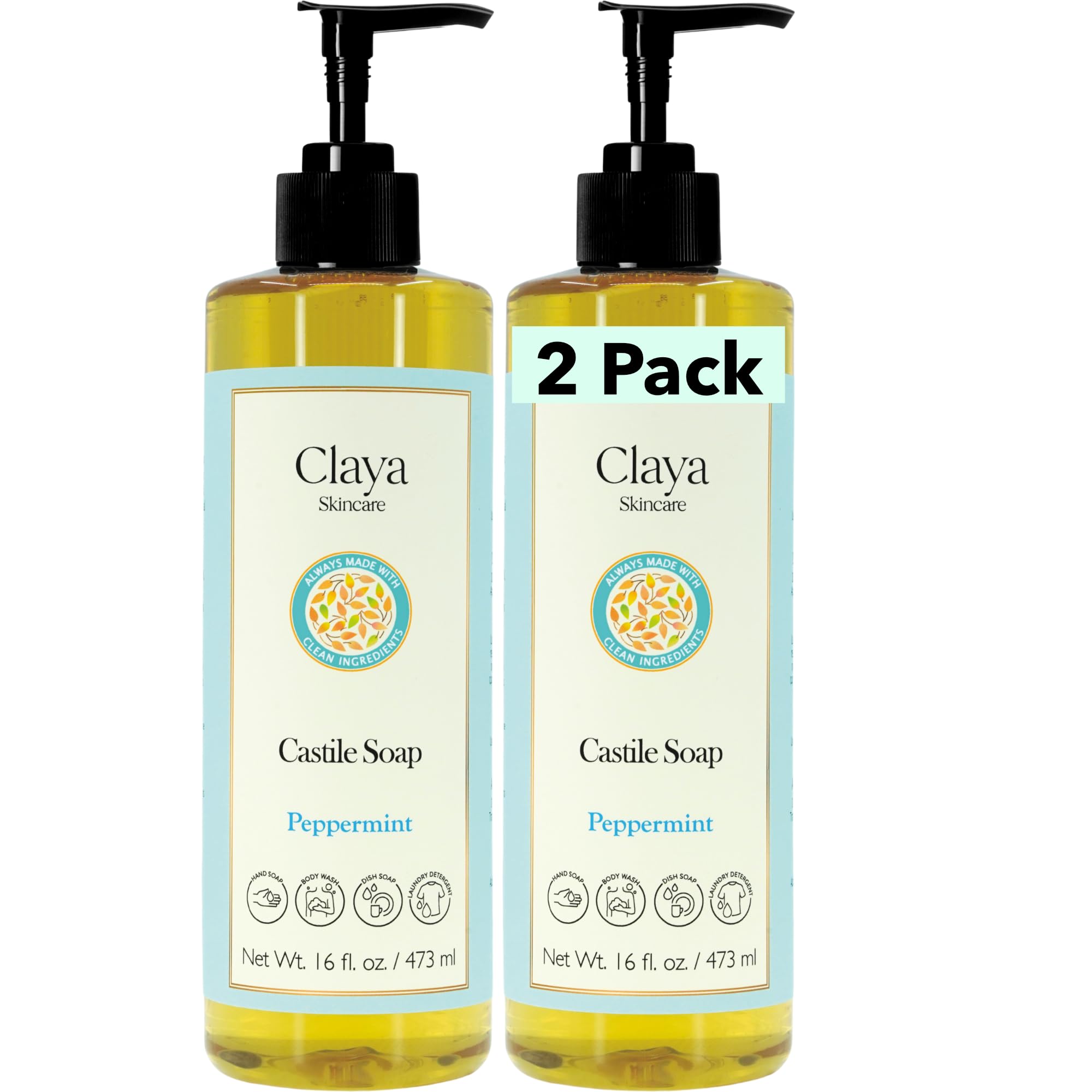 One Bottle, Endless Possibilities. Claya's Liquid Castile Soap is the powerful, all-natural concentrate that replaces a cabinet full of single-use products. Dilute a little for a gentle face wash, or more for an effective floor cleaner. From shampoo to laundry detergent, one bottle does it all. 100 VEGAN, CRUELTY FREE, and NON-GMO. Claya's Cleansing Soaps are environmentally friendly, made with 100 biodegradable ingredients. We formulate using only natural, plant-based, and renewable resources, ethically sourced for a clean conscience. Our products are—and always will be—cruelty-free. Gentle Cleansing, Powered by Nature. We've formulated our hypoallergenic soap with a blend of three organic oils: Castor, Coconut, and Extra Virgin Olive Oil. Together, they provide a thorough yet non-stripping cleanse, specially designed for sensitive skin and to soothe concerns like eczema and psoriasis. Claya's Castile Soap is made with Organic Sustainable plant-based oils and ingredients, without any fillers! The 30-60-10 Ratio of Organic Olive, Organic Coconut, and Organic Castor Oil produces a cleansing lather without using toxic preservatives or foaming agents. It's good for your skin and even better for the environment: soap made from only pure, biodegradable plant oils. 100 REAL NATURAL Soap from Organic Extra Virgin Olive Oil, Organic Castor Oil, and Organic Coconut Oil. MANUFACTURED IN CALIFORNIA. 100 PALM OIL FREE SOAP! Choose our UNSCENTED Soap for a baby mild formula, free of essential oils and fragrance parfum. 2x more concentrated than ordinary liquid soaps. 100 PCR Recycled plastic bottle!.