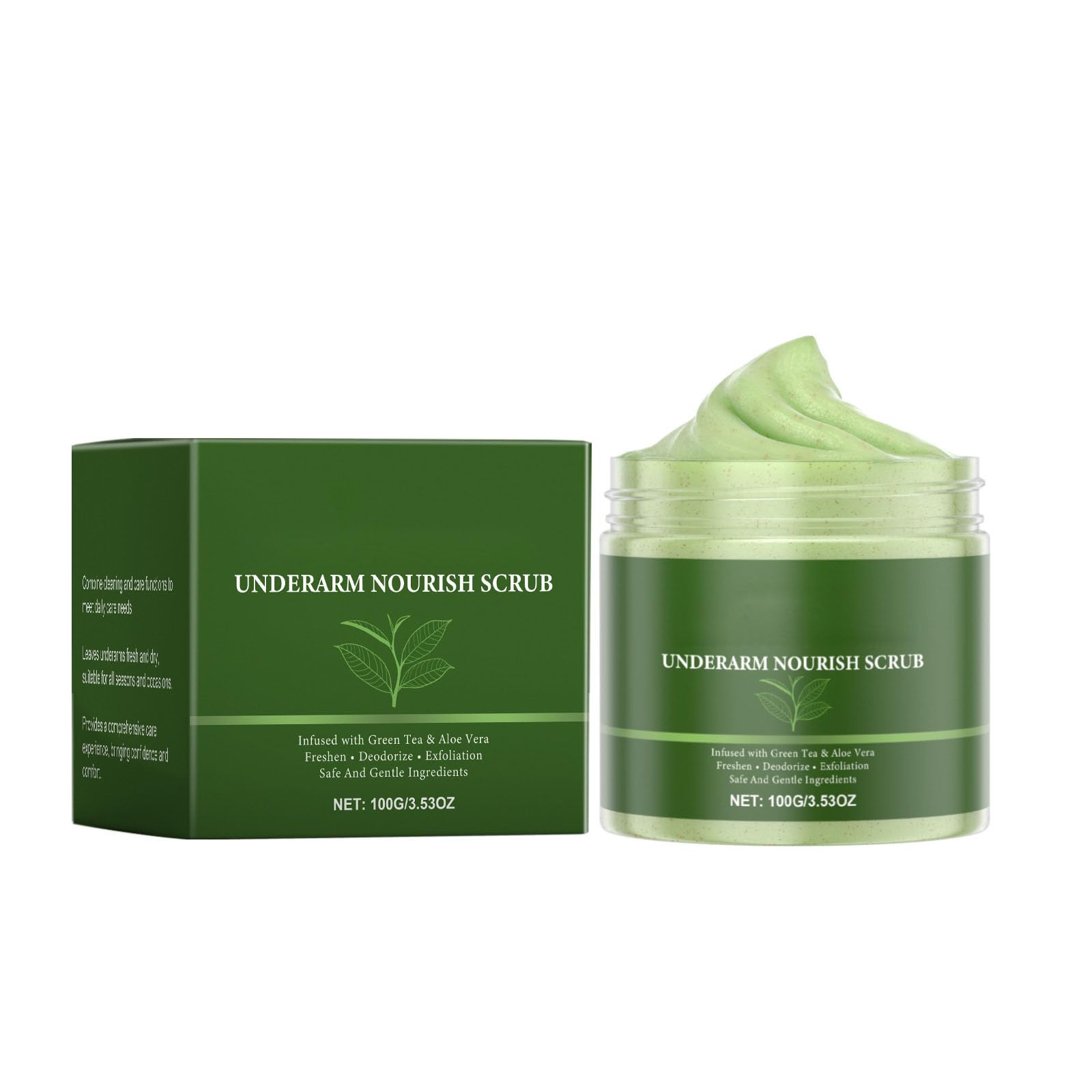 FEATURES: 1. This underarm scrub uses fine granules, has a lightweight texture that spreads easily, and leaves no residue after cleansing. Suitable for all skin types. 2. Our scrub deeply cleanses, removing dirt and excess oil, exfoliating dead skin, unclogging pores, and firming and moisturizing, leaving your skin hydrated and smooth. 3. Effectively removes dead skin cells and odor, nourishes the skin, provides long-lasting hydration, maintains oil-water balance, leaving skin pure, radiant, smooth, and soft. 4. Improves skin texture, enhances radiance, helps soften rough areas, and makes skin smoother. Regular use can remove impurities clogging pores, leaving dull and uneven skin smooth and refined. Specifications: Name:Body Scrub Net content:100G Applicable people: General Skin Type: General PACKAGE CONTENT: 1Pc Body ScrubHow to Use After showering, apply an appropriate amount of scrub to the underarms or other areas, massaging in circular motions for 30 seconds to 1 minute, then rinse thoroughly with water. After use, the underarms are clean, refreshed, and have a fresh scent. Multi-Use This underarm scrub is not only suitable for underarms but also for legs, knees, feet, hands, and the whole body. Gentle and non-irritating, it nourishes and moisturizes, and is safe for sensitive skin. Suitable for all skin types. Plant-Based Formula Our underarm scrub contains peppermint leaf, green tea extract, and aloe vera extract. Its gentle ingredients nourish sensitive skin, are gentle and non-irritating, and help soothe the skin, removing odor and dead skin cells. Gentle Exfoliation This body scrub gently removes dry, dead skin, unclogs pores, and removes impurities, helping to prevent sweat and odor buildup. After each use, skin is softer, smoother, and nourished without causing irritation. Underarm Scrub This underarm scrub deeply cleanses pores, removes impurities and odor, nourishes the skin without causing irritation, and leaves skin refreshed and balanced.Ideal for daily underarm cleansing and deodorization.