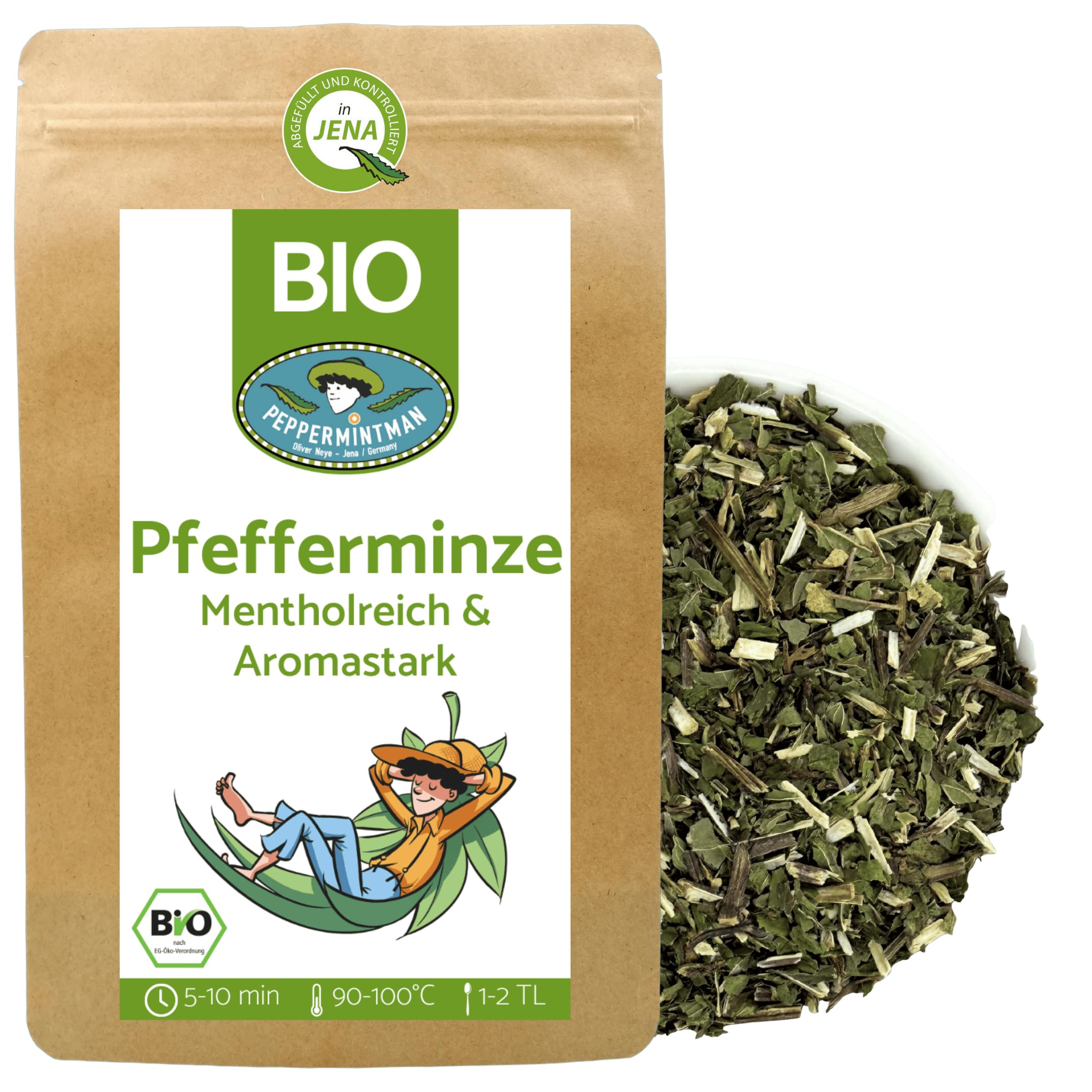 Thé à la menthe poivrée bio 500 g - Riche en menthe et arôme - Culture européenne par une entreprise familiale - En vrac et séché - PEPPERMINTMAN Thé à la menthe poivrée bio 500g
