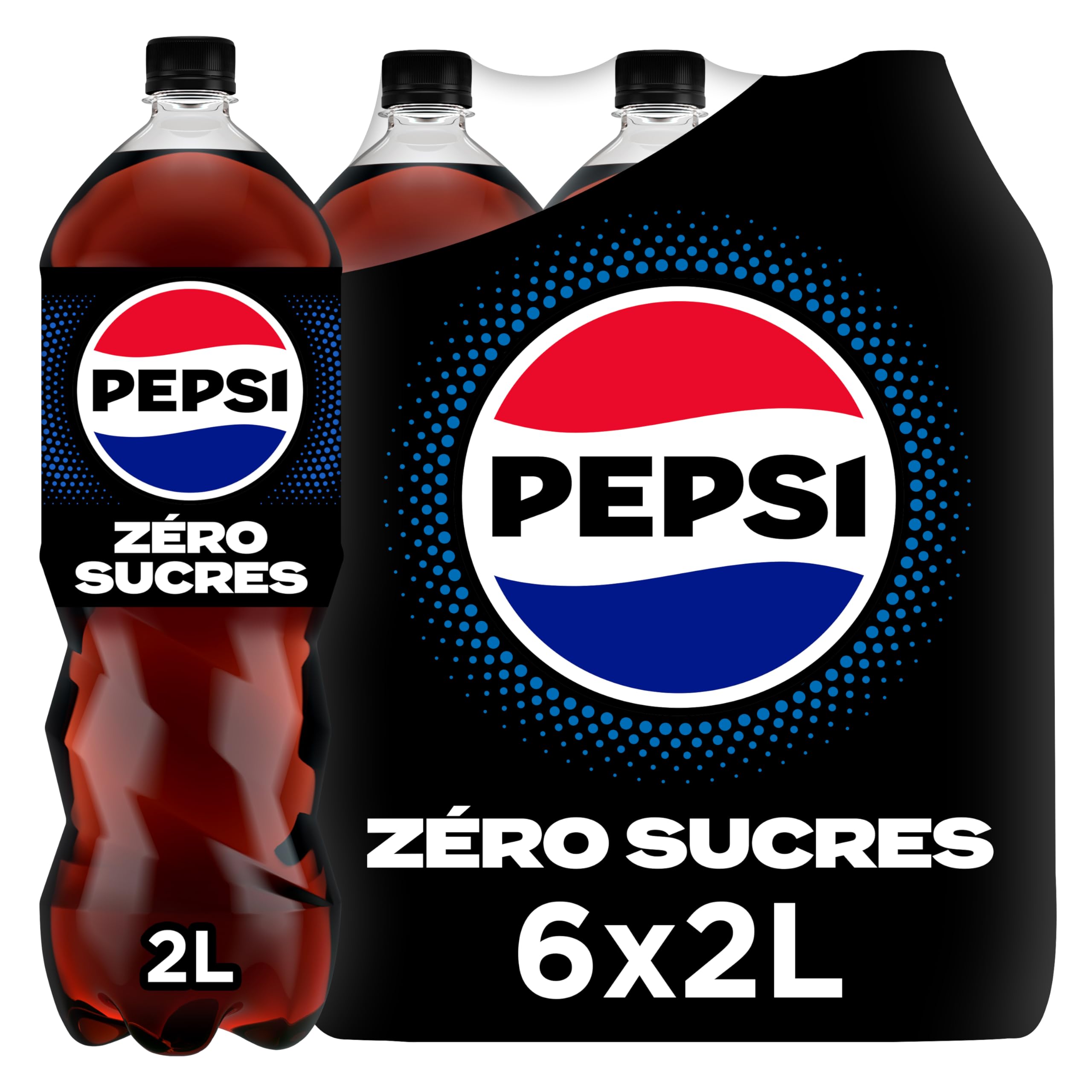 Sugar, carbonated water. Country of origin: USA. None. PEPSI ZERO, A RESPONSIBLE SODAS BRAND: As a responsible soda brand, Pepsi Zero continues its commitment to the environment by producing bottles made from 100 recycled plastic (excluding cap and label). A MUST-HAVE DIET SODA FOR 30 YEARS: Launched in 1994, Pepsi Zero Sugar (originally known as Pepsi Max) is an iconic, bold, and innovative sugar-free cola brand. AN IDEAL SIZE FOR APERITIF: This 6-pack of 2L bottles is perfect for aperitifs. This size ensures everyone can have their glass of Pepsi Zero. A REFRESHING SPARKLING DRINK TO ENJOY AT ANY TIME OF DAY: Loved worldwide, Pepsi is a sparkling beverage best enjoyed ice cold, accompanying young people and families in their daily lives: during meals, barbecues or picnics, during a break, as an aperitif with friends, or to celebrate festive occasions, Pepsi is the sparkling drink to accompany both savory and sweet treats. PEPSI ZERO, MAXIMUM TASTE, ZERO SUGAR: Treat yourself to Pepsi Zero, enjoy a uniquely refreshing break combining intensity and fizz, with its legendary taste made from plant extracts, all without sugar and with few calories.