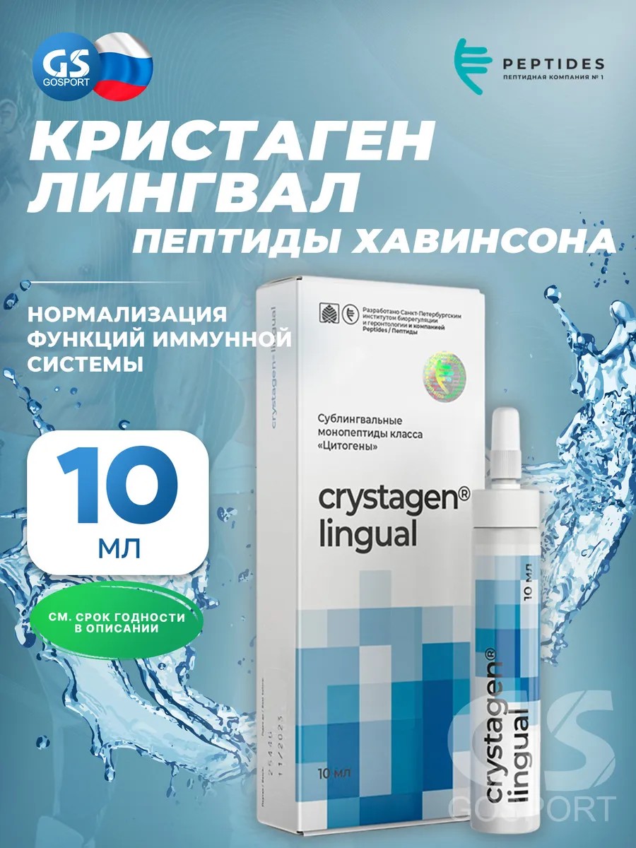 Годен до 30.03.2028. Кристаген (Crystagen) лингвал 10 мл. Пептиды тимуса - КристагенКристаген представляет собой пептидный комплекс, содержащий аминокислоты, способствующие нормализации функции иммунной системы.Иммунитет — это защитная реакция организма от бактерий, токсинов, вирусов, простейших, паразитов, раковых клеток и тому подобное. Известно, что иммунитет может быть снижен вследствие воздействия ряда неблагоприятных факторов. При ожоге, переохлаждении, кровопотере, голодании, после перенесенных заболеваний, хроническом стрессе. В этом случае организм становится более чувствительным к инфекциям, процессы заживления тормозятся, возрастает риск развития опухолевых заболеваний. Нормальное функционирование иммунной системы обеспечивает высокий уровень антистрессовой, противоинфекционной и противоопухолевой защиты организма. Для коррекции иммунной системы и предотвращения нарушений гормоногенеза, происходящих при различных заболеваниях, был разработан биорегулятор иммунной системы — Кристаген.При клиническом изучении установлена эффективность Кристагена в комплексной профилактике и лечении пациентов с нарушением функции иммунной системы после перенесенных инфекционных заболеваний, лучевой и химиотерапии, психоэмоционального стресса, воздействия на организм различных неблагоприятных факторов (в том числе экологических, климатических, геопатогенных факторов и ионизирующего излучения), а также для поддержания функции иммунной системы у людей пожилого и старческого возраста.Экспериментальное изучение биологических свойств Кристагена показало, что при его применении улучшаются не только отдельные показатели клеточного и тканевого гомеостаза в иммунных клетках, но и нормализуются функции иммунной системы в целом. Курсовой прием Кристагена способствует заметному улучшению общего состояния и, прежде всего, снижению выраженности астенического синдрома, характерного для вторичного иммунодефицита. У больных с гнойно-воспалительными осложнениями после хирургических вмешательств установлено достоверное повышение активности тканевых ферментов, о чем свидетельствует ускоренная эпитализация ран. У пациентов с последствиями лучевой и химиотерапии при приеме Кристагена отмечалась ускоренная нормализация иммунологических показателей периферической крови, улучшение общего самочувствия и снижение частоты возникновения инфекционных осложнений.Кристаген хорошо переносится пациентами, при этом не было выявлено побочного действия, осложнений, противопоказаний и лекарственной зависимости.Рекомендован: острые и хронические воспалительные заболевания различной этиологии, ОРВИ, ангины, бронхиты, отиты, гаймориты, пневмонии, циститы, пиелонефриты, простатиты, аднекситы, предоперационный и послеоперационный периоды при различных оперативных вмешательствах, генерализованные инфекции, системные заболевания соединительной ткани, аутоиммунные заболевания различной этиологии, состояния после экстремальных стрессорных нагрузок, при сниженном иммунитете, поддержание функции иммунной системы у людей пожилого и старческого возраста, для профилактики онкологических заболеваний, хронические интоксикации, период реабилитации после инфаркта и инсульта, омоложение организма в составе комплексных программ