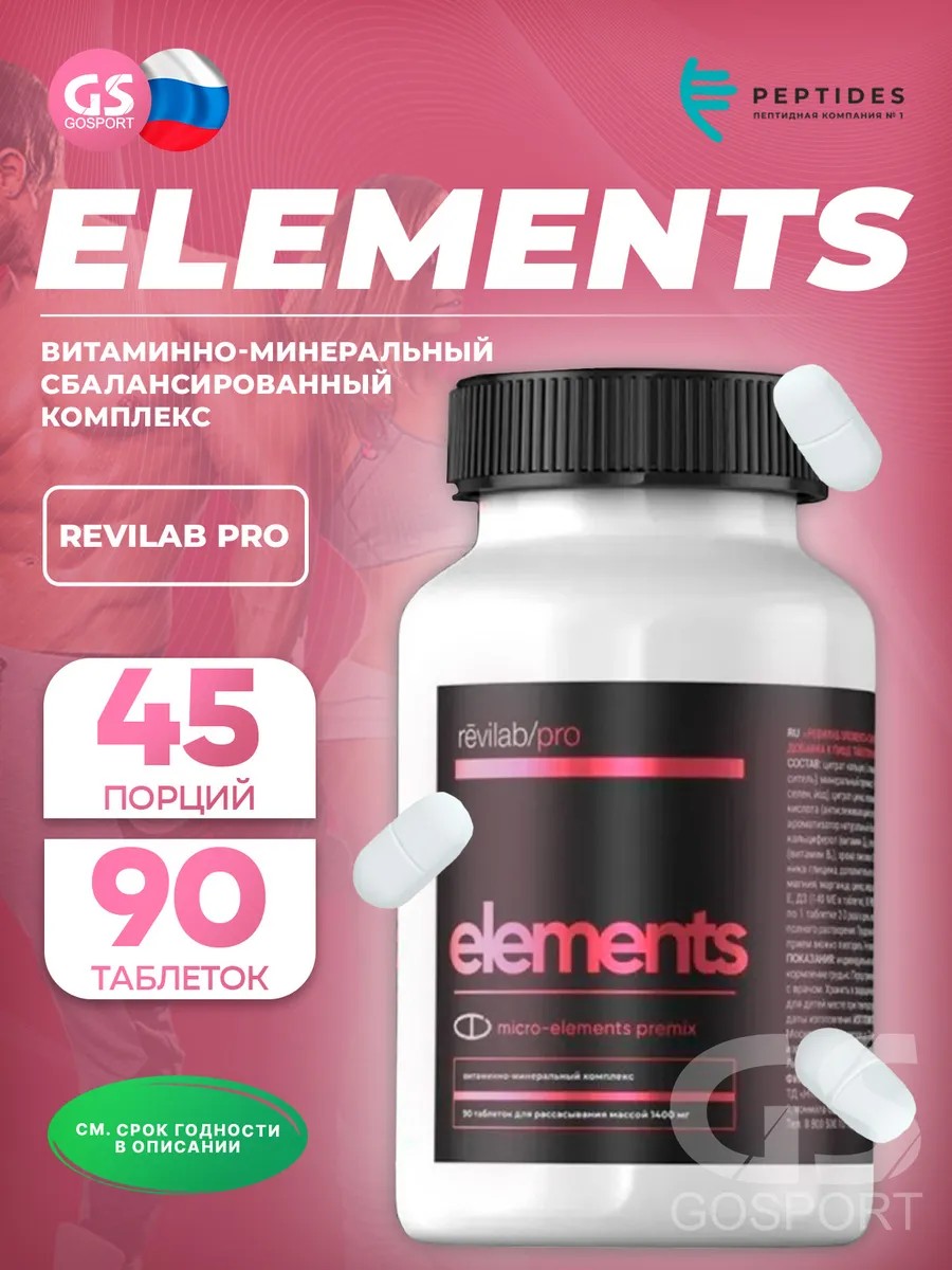 Годен до 03.04.2026. Витаминно-минеральный комплекс Revilab Elements 90 таблеток. Revilab Pro elementsВосполняет недостаточность в рационе питания витаминов (А, Е, D3, В6), микро- (селен, йод, медь, хром, марганец, железо, цинк) и макроэлементов (кальций, магний), необходимых для восстановления баланса коллагена в тканях, и L-глицин — важнейший компонент коллагена.Это новейшая разработка, являющаяся безоговорочной альтернативой всем минеральным препаратам, созданным ранее. Уникальный состав на базе макро- и микроэлементов, минералов и витаминов способствует коррекции биохимических процессов, перезарядке митохондрий, оптимизации работы иммунной системы. Благодаря синергии компонентов происходит активный процесс регенерации кожи, стимулируется синтез коллагена, оказывается положительное влияние на выработку половых гормонов, что дает качественное улучшение репродуктивного здоровья.Действие: обеспечивает антиоксидантную защиту организма и минимизирует неблагоприятное воздействие окружающей среды; восполняет необходимое количество нутриентов для правильной работы митохондрий; поддерживает уровень витаминов и минералов для синтеза половых гормонов; восполянет недостаток коллагена; предотвращает появление морщин; укрепляет структуру хрящевой ткани, поддерживает подвижность суставов; способствует замедлению старения организма.Revilab elements имеет комбинированный и сбалансированный состав, который включает в себя:Глицин - одна из основных аминокислот, из которых состоит коллаген. При стрессе и сильных нагрузках организм забирает этот фибриллярный белок из костей и суставов, поэтому глицин необходим как один из прекурсоров для восполнения количества коллагена в организме. Также улучшает метаболические процессы в тканях мозга, стимулирует функции гипофиза, способствует нормализации сна и повышении умственной работоспособности.Кальций - необходим для формирования костного вещества, свертывания крови, осуществления процесса передачи нервных импульсов, сокращения скелетных и гладких мышц, нормальной деятельности миокарда.Магний - способствует нормализации артериального давления, стимулирует совместно с кальцием выработку кальцитонина и паратиреоидного гормона, предупреждает отложение солей кальция в почках.Железо - участвует в эритропоэзе, в составе гемоглобина обеспечивает транспорт кислорода в ткани.Цинк - активно участвует в процессе регенерации и обновления кожи, роста волос, стимулирует синтез коллагена и кератина. Проявляя антиоксидантные свойства, цинк способствует замедлению процессов клеточного старения. Является ключевым микроэлементом с точки зрения репродуктивного здоровья: оказывает значительное влияние на выработку мужских и женских половых гормонов. Обладает иммуномодулирующими свойствами, способствует усвоению витамина А.Медь - способствует образованию коллагена, всасыванию железа и играет важную роль в производстве энергии. Повышает прочность и эластичность сосудов, воздействуя на белки соединительной ткани. Медь необходима для выработки половых гормонов и нормальной работы репродуктивной системы.Селен - обладает выраженным антиоксидантным действием, способствует нейтрализации избытка свободных радикалов, разрушающих клеточные мембраны; оказывает защитное действие при поступлении в организм че