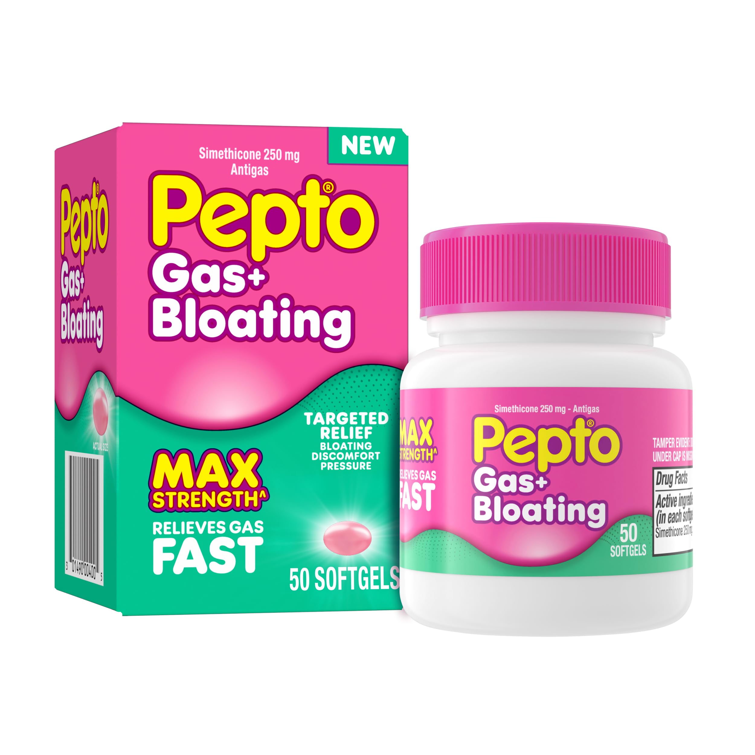 Pepto Gas Bloating: Fast Gas Relief, including Bloating Relief, Discomfort Relief, and Pressure Relief with Simethicone 250 mg Softgels. Find fast gas relief with Pepto's simethicone 250 mg softgels! Unlike Pepto Bismol, Pepto Gas Bloating is specifically formulated with simethicone for targeted gas relief for adults. Our easy-to-swallow simethicone 250mg softgels provide maximum strength gas relief for adults and goes to work in MINUTES. Pepto's compact 50-count simethicone 250 mg softgels are perfect for on-the-go gas relief. When gas and bloating bother you, reach for Pepto Gas Bloating! Enjoy targeted gas relief for adults with simethicone 250 mg softgels and get back to your day.
