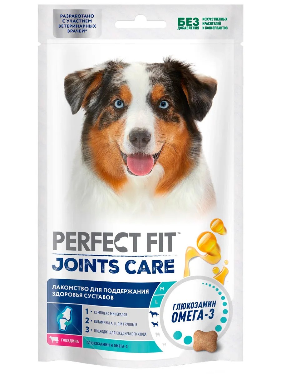 Функциональное лакомство Perfect fit joints с говядиной и добавлением рыбьего жира и глюкозамина поможет поддержать здоровье суставов вашей собаки/