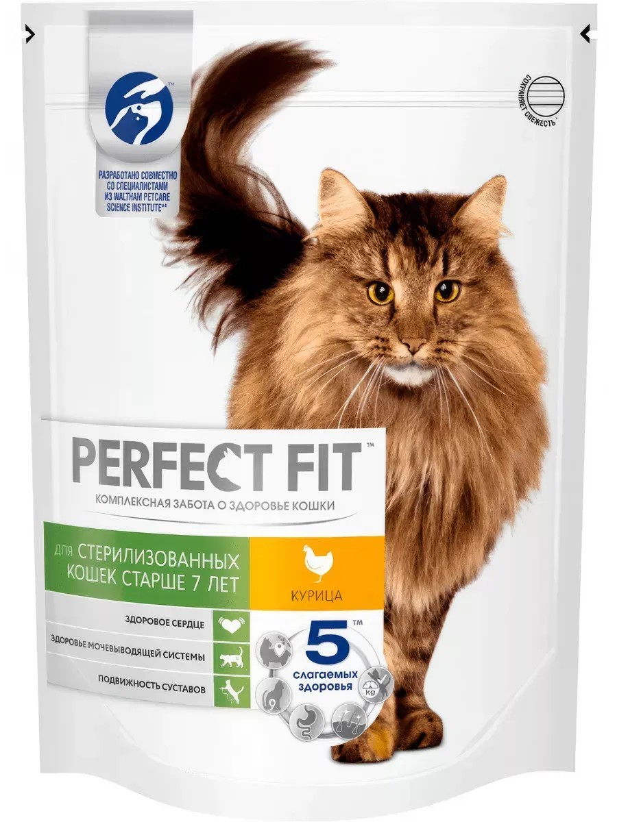 Корм Perfect Fit для стерилизованных кошек старше 7 лет, с курицей, 650 г. Сухой корм для кошек старше 7 лет, с курицей Потребности кошек существенно меняются в процессе старения. Поэтому мы разработали рацион Perfect Fit для стерилизованных кошек старше 7 лет. Он содержит таурин, поддерживающий активную работу сердца, и глюкозоамин и омега-3 кислоты, которые позаботятся о здоровье суставов кошки. Здоровое сердце. Содержит таурин, незаменимую для кошек аминокислоту, помогающую поддерживать сердце сильным и здоровым Здоровье мочевыводящей системы. Баланс минералов, помогающий снижению риска формирования камней и поддержанию здоровья мочевыводящей системы. Подвижность суставов. Содержит натуральный источник глюкозамина и омега-3 жирных кислот, помогающих поддерживать подвижность суставов Рекомендации по кормлению: Корм предназначен для кошек в возрасте старше 7 лет: Для кошек массой 3 кг 45 грамм корма в день Для кошек массой 4 кг 55 грамм корма в день Для кошек массой 5 кг 65 грамм корма в день. Миска со свежей питьевой водой должна постоянно быть рядом с местом кормления. Ингредиенты: мука животного происхождения (в том числе из курицы), пшеничная мука, кукурузная мука, рис, концентрат соевого белка, концентрат кукурузного белка, бульон из продуктов животного происхождения, животные жиры и растительные масла (в том числе рыбий жир), концентрат пшеничного белка, минеральные вещества, пивоваренные дрожжи, высушенная мякоть сахарной свеклы, витамины, аминокислоты (таурин, метионин), натуральный карамельный краситель, глюкозамин, антиоксиданты. Содержание питательных веществ (100г): белок - 36,0 г; жир - 13,0 г; зола - 8,5 г; клетчатка - 1,7 г; влага - 6,0 г; витамин А - 670 МЕ; витамин E - 23 мг. Добавленные вещества (1кг): витамин D3 - 2400 ME; таурин - 4500 мг; цинк - 120 мг; железо - 35 мг; марганец - 10 мг; медь - 7,0 мг; йод - 3,0 мг. Энергетическая ценность (100г): 385 ккал / 1612 кДж.