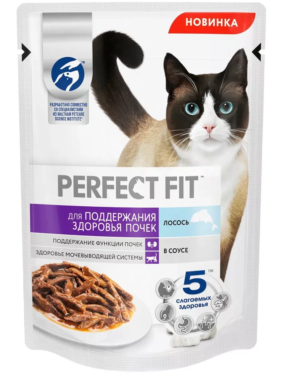 Perfect Fit Kidney Health Cat Food (in Gravy) with Salmon, 75 g, 28 pcs. Perfect Fit Kidney Health Cat Food (in Gravy) with Salmon PERFECT FIT Kidney Health wet food for adult cats with salmon is specially formulated to support feline kidney health. Benefits: Urinary tract health. Helps maintain urinary tract health in cats, reducing the risk of developing urolithiasis. Kidney function support. Limited levels of phosphorus, Omega-3 fatty acids, and potassium help maintain kidney health. Five components of health: Supports the body's natural defenses. Taurine, vitamins C and E support the body's natural defenses. Supports urinary tract health. A balance of minerals helps maintain urinary tract health and reduce the risk of kidney stones. Chicken and rice for healthy digestion. High-quality protein and rice for easy digestion and optimal digestion. Smooth coat and healthy skin. Help maintain healthy skin and coat thanks to zinc and sunflower oil, a natural source of omega-6 fatty acids. Optimal weight management. Contains L-carnitine, which helps maintain optimal weight. Ingredients: Meat and by-products at least 30%, fish and fish by-products (salmon), grain flour (wheat, rice), blood plasma, amino acids (including methionine and taurine), thickeners, minerals, fish oil, vitamins, xylose, sunflower oil, natural colorant beta-carotene. Nutritional content (100 g) Protein 8.5 g Fat 3.5 g Ash 1.5 g Fiber 0.1 g Moisture 83 g Energy value 77 kcal / 322 kJ Vitamin and antioxidant content (100 g) Vitamin A not less than 200 IU Vitamin E not less than 4 mg Feeding recommendations Your cat should be fed food at room temperature. Pet's weight (kg) 3 4 5 Wet only 3 pcs 3.5 pcs 4 pcs Wet + dry 2 pcs + 15 g 3 pcs + 20 g 3 pcs + 35 g