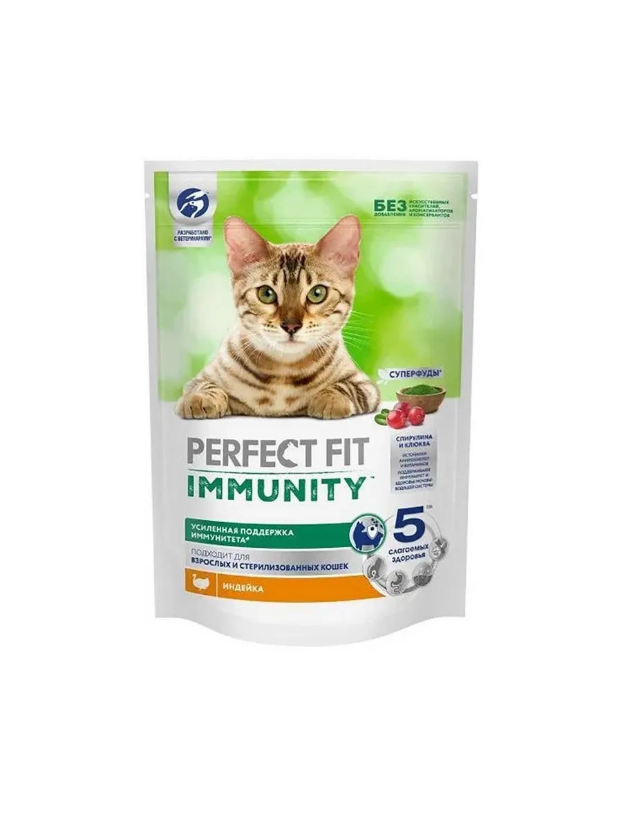 Dry food PERFECT FIT IMMUNITY for maintaining the immunity of cats, with turkey and the addition of spirulina and cranberries. COMPOSITION: Meat and its derivatives (including turkey), vegetable proteins, wheat flour, corn flour, rice, broth from animal products, animal fats and vegetable oils, minerals, yeast, vitamins, dried sugar beet pulp, amino acids (taurine, methionine), natural caramel color, antioxidants, dried spirulina, dried cranberries. COMPOSITION ANALYSIS: Protein 37.0 g Fat 12.0 g Ash 8.6 g Fiber 1.7 g Moisture 6.0 g Vitamins: vitamin A 670 IU; vitamin E 25 mg. Energy value (100 g): 380 kcal/1590 kJ