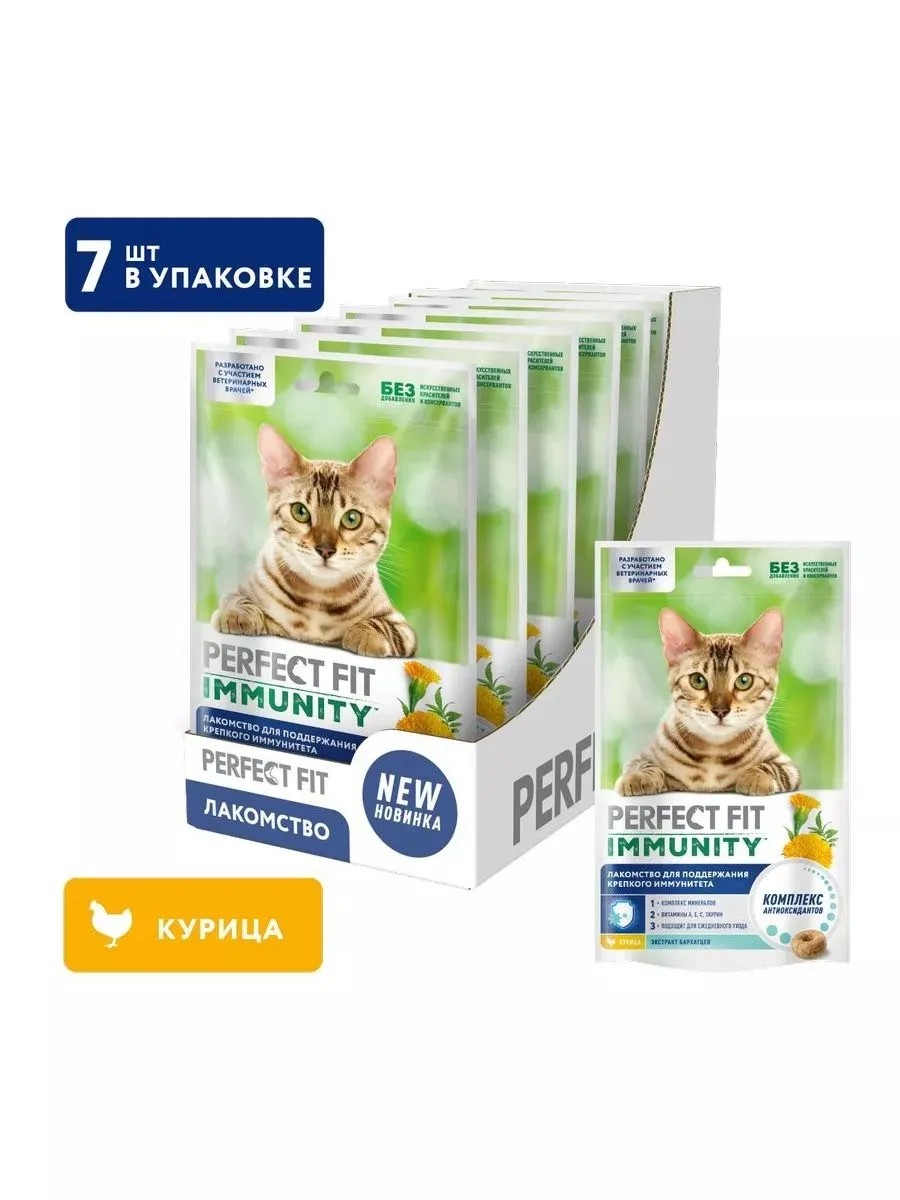 Функциональные лакомства PERFECT FIT - это линейка профессиональных лакомств, созданная специально для ежедневного ухода за здоровьем вашего питомца. Функциональное лакомство PERFECT FIT с курицей и добавлением экстракта бархатцев поможет поддержать крепкий иммунитет вашей кошки. Особый комплекс антиоксидантов (витамины А, Е, С, таурин и экстракт бархатца) помогает организму поддержать здоровый иммунитет при соблюдении рекомендаций по кормлению. Функциональное лакомство PERFECT FIT IMMUNITY подходит для котят от 4 месяцев и стерилизованных кошек. В основе рецептуры функционального лакомства PERFECT FIT IMMUNITY лежит особая формула, разработанная совместно с ветеринарными врачами Центра изучения питания домашних животных ООО «Марс». Лакомство производится без добавления искусственных красителей и консервантов. В линейке функциональных лакомств PERFECT FIT также представлены лакомства, которые закрывают потребности в поддержании крепкого иммунитета собак мелких и миниатюрных пород и поддержании здоровья суставов собак средних и крупных пород.Состав: продукты растительного происхождения (в том числе экстракт бархатцев), животные жиры и растительные масла (в том числе подсолнечное масло), мука из домашней птицы, гидролизат из продуктов животного происхождения, пивные дрожжи, минеральные вещества, аминокислоты (в том числе таурин), витамины, антиоксиданты.