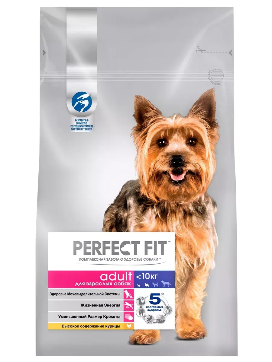 Корм Perfect Fit для собак малых и миниатюрных пород, с курицей, 6 кг. Сухой корм для взрослых собак мелких и миниатюрных пород, с курицей В дополнение к уникальной формуле PERFECT FIT 5 слагаемых здоровья , каждая рецептура учитывает особые потребности собаки с учетом ее возраста и особенностей размера породы. ЗДОРОВЬЕ МОЧЕВЫДЕЛИТЕЛЬНОЙ СИСТЕМЫ - Специальная формуля для поддержания здоровья мочевыводительной системы ЖИЗНЕННАЯ ЭНЕРГИЯ - Содержит повышенные уровни витаминов В1, В2, В6 и железа, способствующие поддержанию активности собаки УМЕНЬШЕННЫЙ РАЗМЕР КРОКЕТЫ - Уменьшенный размер крокеты, специально разработанный для собак миниатюрных и мелких пород* Размер крокеты меньше, чем для щенков средних и больших пород (Adult 10 kg). Состав: сухой белок домашней птицы (в том числе курица), пшеница, мука кукурузная, рис, жир животный, масло подсолнечное, гидролизат животного происхождения, высушенная мякоть сахарной свеклы (3,5 %), белковый гороховый концентрат, минералы, соль, сухое цельное яйцо, натрий триполифосфат (0,7 %), холин хлорид (витамин В4), экстракт цикория (0,2 %), витамины. Содержание питательных веществ (100 г): белок 27 г; жир 17 г; зола 8,0 г; клетчатка 2,5 г; кальций 1,54 г; фосфор 1,2 г; железо 11,5 мг; натрий 1,1 г; витамин А 1292 МЕ; витамин D3 142,5 МЕ; витамин Е 40,5 мг. Добавленные вещества (кг): витамин В1 16 мг; витамин В2 24,8 мг; витамин В6 6,1 мг; Кальция иодат 2,64 мг; моногидрат сульфата марганца 16,7 мг; пентагидрат сульфата меди 36,8 мг; моногидрат сульфата цинка 339 мг; органическая форма селена (селенметионин) 120,5 мг. Энергетическая ценность (100 г): 385 ккал / 1624 кДж. Рекомендации по кормлению При переходе на корм Perfect Fit с курицей для взрослых собак мелких и миниатюрных пород старше одного года, постепенно вводите его в рацион собаки в течение 4 дней.