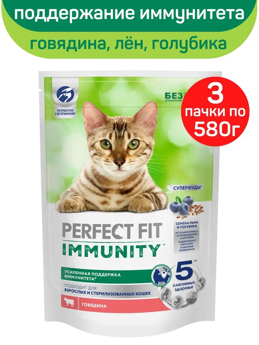 PERFECT FIT Сухой корм для кошек Immunity, говядина лен, 3шт по 580г