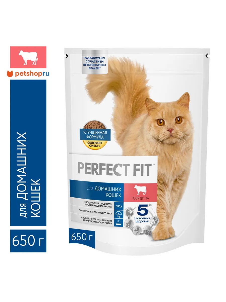 Сухой рацион PERFECT FIT для домашних кошек оптимален для кошек, живущих в помещении. Гладкая шерсть и здоровая кожа
