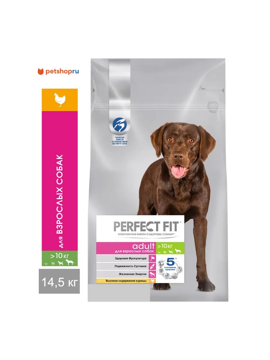 Система профессионального питания Perfect Fit разработана совместно с диетологами и ветеринарами и специально создана для поддержания активности и жизненной энергии собаки на протяжении всей жизни. В основе профессионального рациона Perfect Fit лежит уникальная формула PERFECT FIT TOTAL 5 FORMULA, которая заботится о важнейших слагаемых здоровья в соответствии с размером и возрастом собаки. Также данная рецептура учитывает особые потребности взрослых собак средних и крупных пород: содержит белки высокого качества для поддержания сильной и здоровой мускулатуры