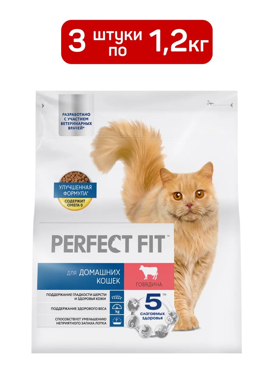 PERFECT FIT Сухой корм для домашних кошек, говядина, 3шт по 1.2кг