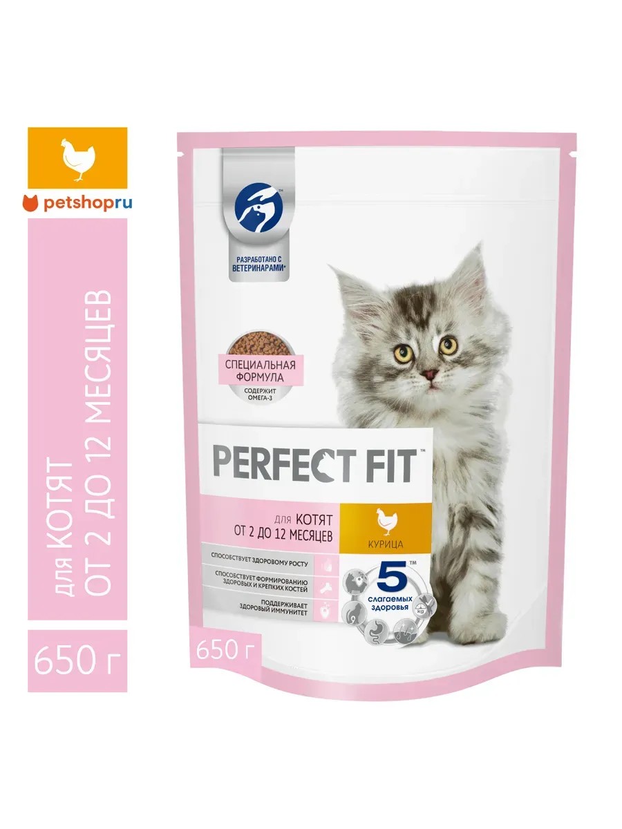 Сухой рацион PERFECT FIT (Перфект Фит) для котят от 2 до 12 месяцев содержит всё самое необходимое для здорового роста котёнка: важнейшие микро- и макро- элементы, такие, как кальций и фосфор, для укрепления костей и жирные кислоты класса Омега-3 для развития мозга и остроты зрения.