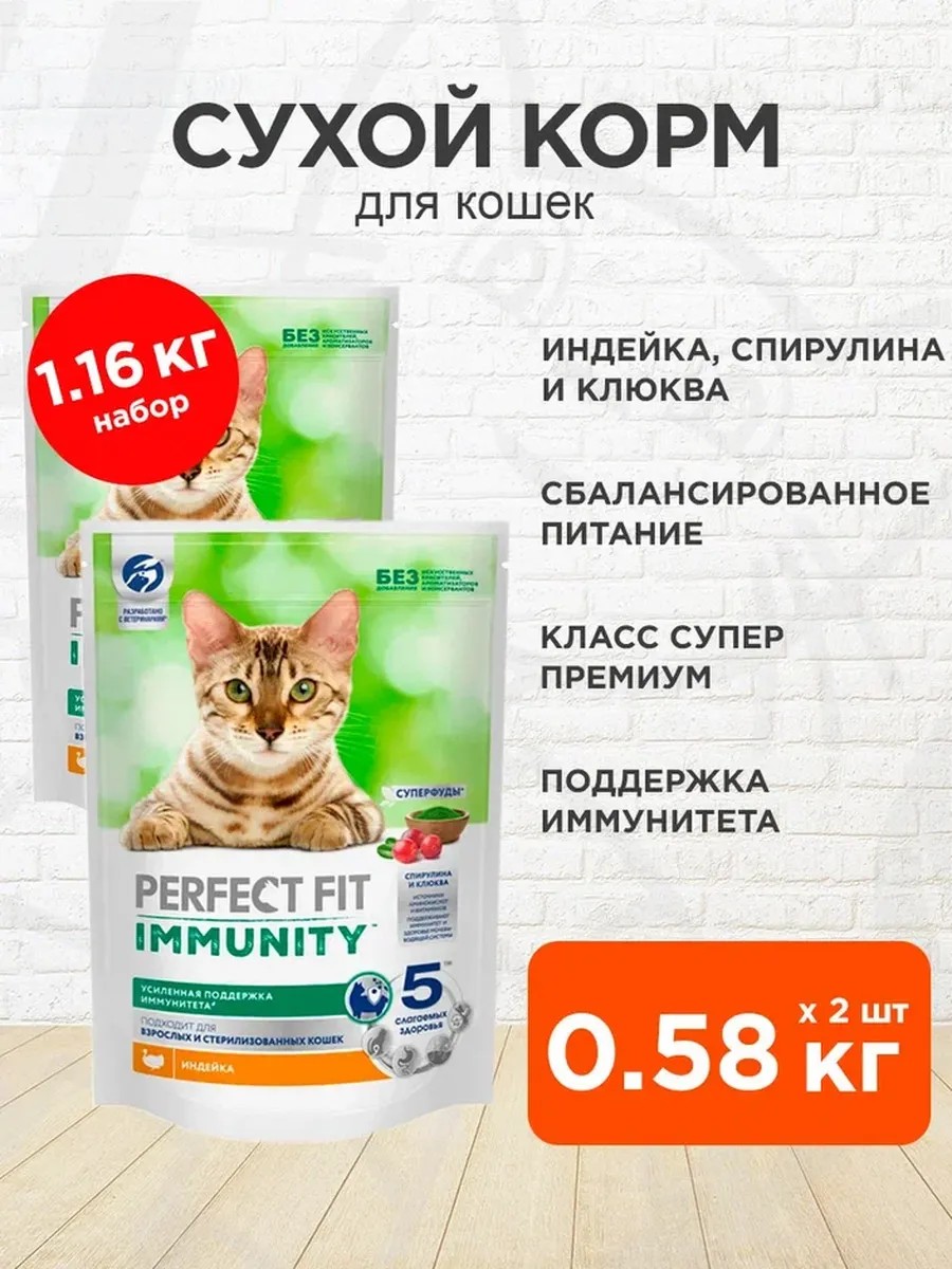 Perfect Fit Корм сухой Immunity для кошек индейка спирулина 0,58 кг 2 шт