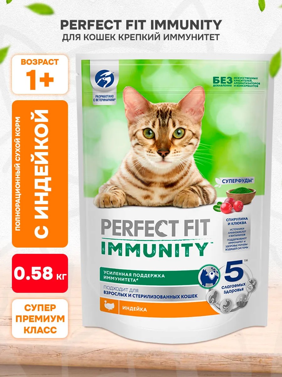Сухой корм Perfect Fit Immunity для поддержания иммунитета кошек, с индейкой и добавлением спирулины и клюквы.