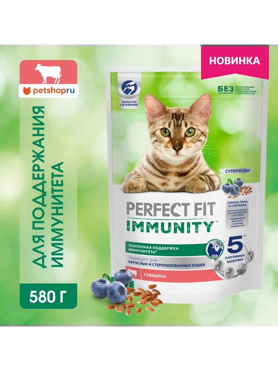 PERFECT FIT Сухой корм Immunity для кошек с говядиной, 580г