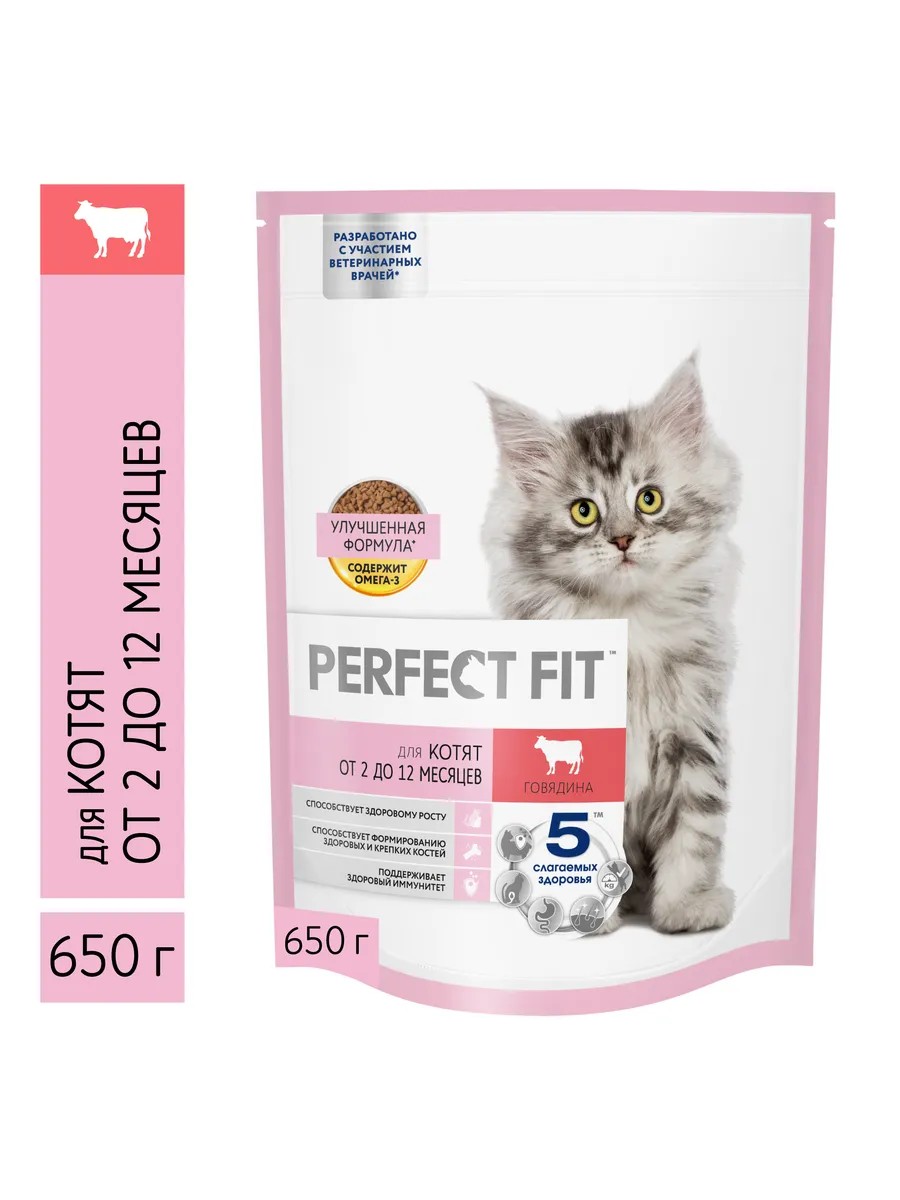 | Полное наименование товара | Perfect Fit корм для котят всех пород с говядиной 650 гр |