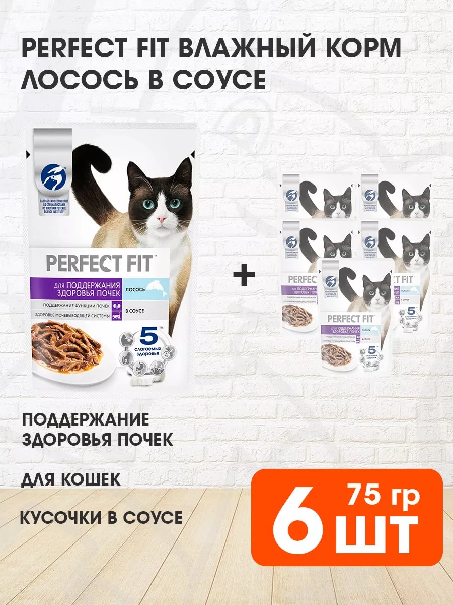 Корм для кошек влажный Perfect Fit - высококачественный рацион для взрослых кошек с лососем разработан специально для поддержания здоровья почек кошек.