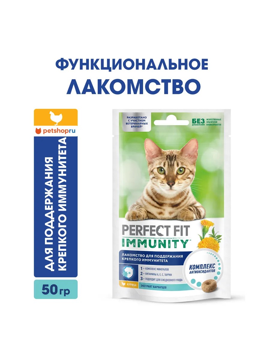 Функциональное лакомство PERFECT FIT (Перфект Фит) IMMUNITY подходит для котят от 4 месяцев и стерилизованных кошек.