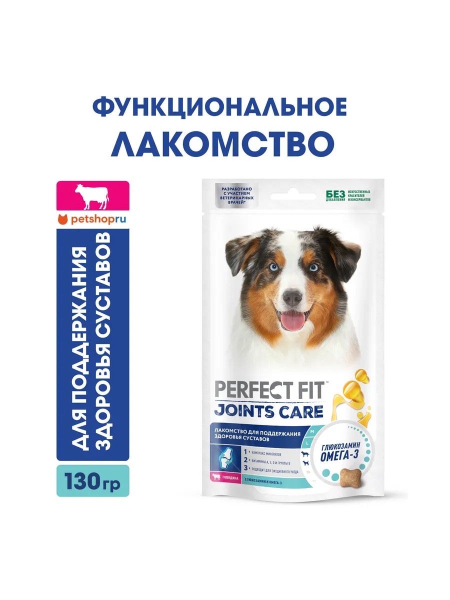 Функциональное лакомство PERFECT FIT (Перфект Фит) JOINTS с говядиной и добавлением рыбьего жира и глюкозамина поможет поддержать здоровье суставов вашей собаки.