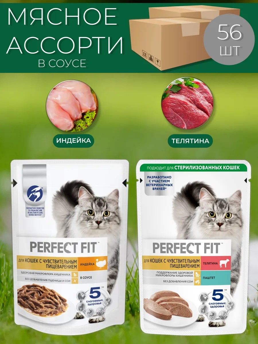 PERFECT FIT Корм Влажный Для Чувствительного ЖКТ Ассорти, 75г x 56 шт