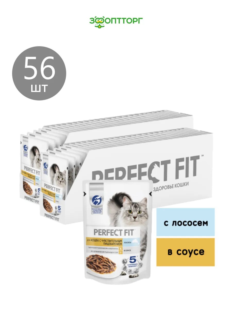 КомплектацияPerfect Fit пауч для кошек с чувствительным пищеварением ( в соусе) Лосось, 75 г - 56 шт.