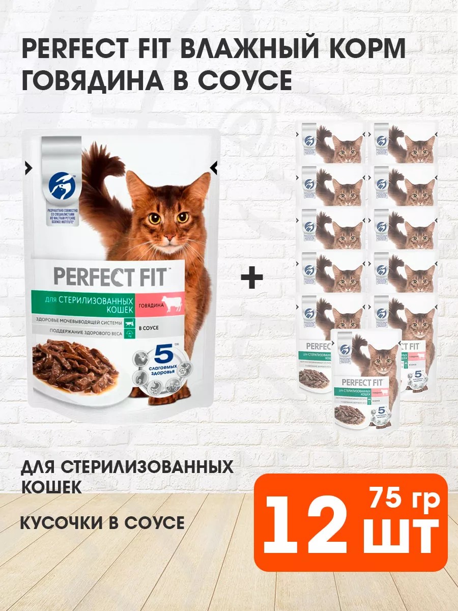Корм для кошек влажный Perfect Fit - высококачественный полноценный сбалансированный рацион с говядиной в соусе, созданный специально для котов и кошек после кастрации и стерилизации.