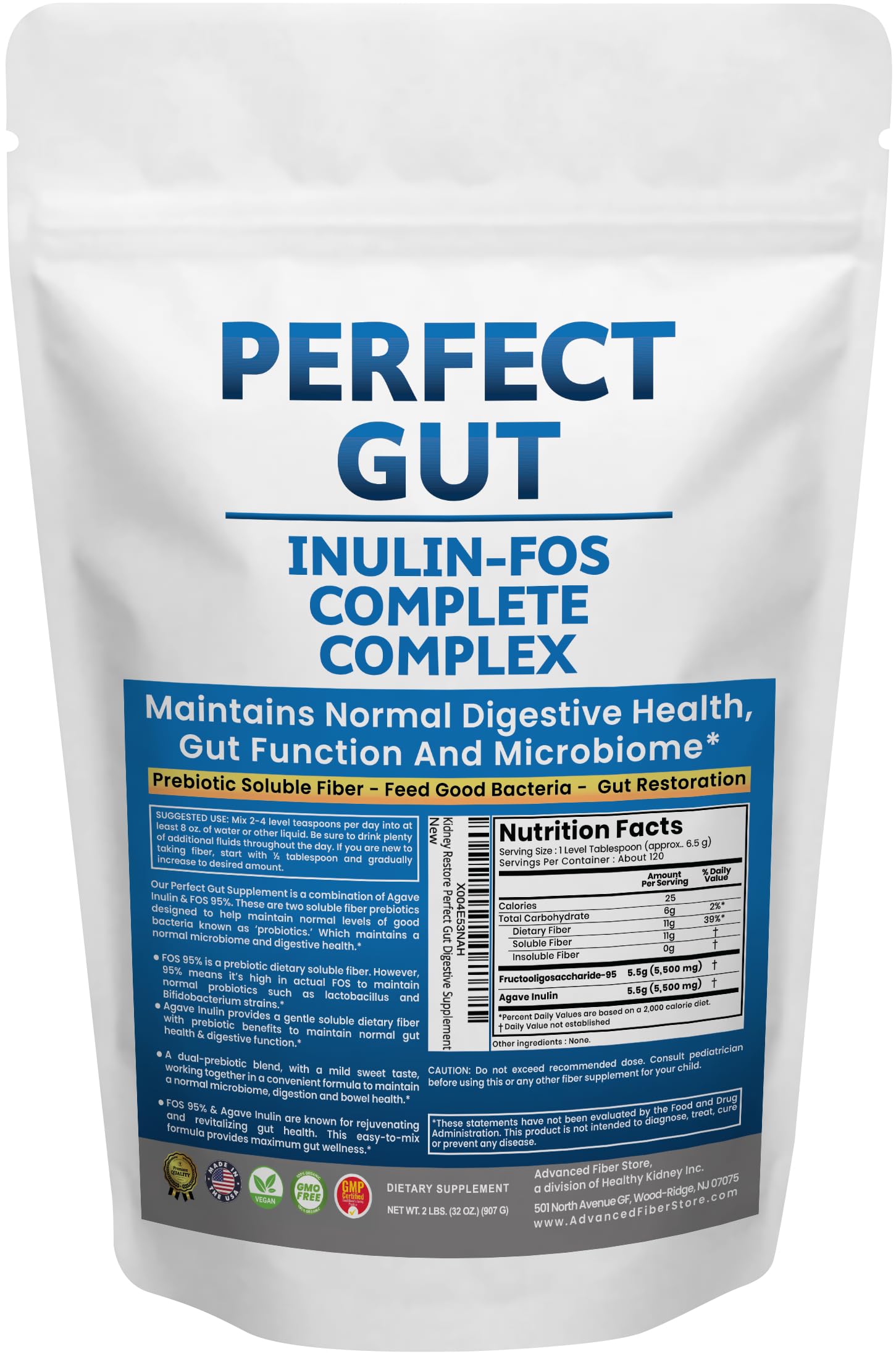 Perfect Gut: Inulin FOS Powder for Gut Health. Prebiotic Inulin. Unique Prebiotic 95% FOS Inulin Agave Fiber 2 Pound (Pack of 1)
