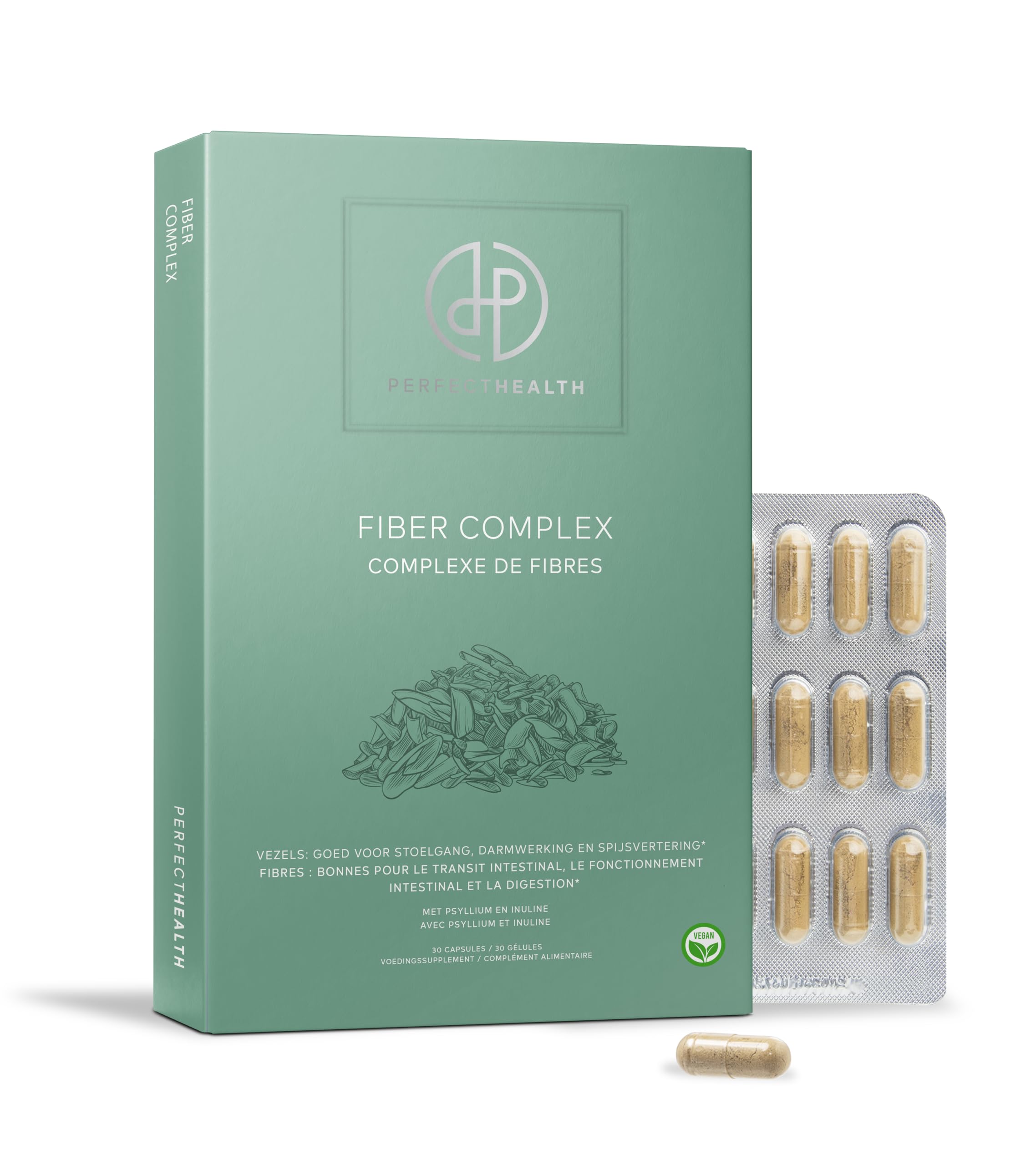 Fiber is important for your health. It promotes bowel movements, intestinal function, and digestion. It provides a feeling of fullness after eating, which helps with weight management, and is good for your cholesterol. A sufficient daily fiber intake reduces the risk of health problems. Fiber Complex contains 80 psyllium and 20 inulin fiber. These are the two most powerful and beneficial fibers. Because they are contained in a capsule, they are an easy addition to your daily fiber intake. Note: For optimal effectiveness, it is important to drink plenty of water. Both the ingredients and the capsule are 100 vegan and comply with the clean label policy. INGREDIENTS Psyllium fiber, inulinBoth the contents and capsule are 100 vegan and comply with the clean label policy. Fiber Complex stimulates natural bowel movements and is good for normal bowel function. Fiber is important for your health! It promotes bowel movements, bowel function, and digestion. It gives you a feeling of fullness, which helps with weight management, is good for your cholesterol, and reduces the risk of health problems. Fiber Complex contains 80 psyllium and 20 inulin fiber. These are the two most powerful and beneficial fibers. Because they are contained in a capsule, they are an easy addition to your daily fiber intake. Note: for proper functioning, it is important to drink enough water. Fiber is important for your health. It promotes bowel movements, bowel function, and digestion. It gives you a feeling of fullness after eating, which helps with weight management, and is good for your cholesterol. A sufficient daily fiber intake reduces the risk of health problems.Perfect Health - Fiber Complex - Voedingssupplement - Goed voor stoelgang, darmen en spijsvertering - 30 capsules - Vegan Aantal items in pakket 30.0DESCRIPTION DU PRODUIT DESCRIPTION DU PRODUIT Vezels zijn belangrijk voor je gezondheid. Ze bevorderen je stoelgang, darmwerking en spijsvertering. Ze geven een verzadigd gevoel na het eten, dat helpt bij gewichtsbeheersing, en zijn goed voor je cholesterol. Dagelijks voldoende vezelinname vermindert het risico op gezondheidsproblemen. Fiber Complex bevat 80 Psyllium en 20 Inuline vezels. Dit zijn de twee krachtigste en meest interessante vezels. Doordat ze zijn verwerkt in een capsule zijn ze een makkelijke aanvulling op je dagelijkse vezelinname. Let op: voor een goede werking is belangrijk dat je voldoende water drinkt. Zowel de inhoud en capsule zijn 100 vegan en conform clean label policy. INGRÉDIENTS Fibres de cosses de psyllium, InulineZowel de inhoud en capsule zijn 100 vegan en conform clean label policy. Fiber Complex stimuleert de natuurlijke stoelgang en is goed voor een normale darmwerking. Vezels zijn belangrijk voor je gezondheid! Ze bevorderen je stoelgang, darmwerking en spijsvertering. Ze geven je verzadigd gevoel, dat helpt bij gewichtsbeheersing, zijn goed voor je cholesterol en verminderen het risico op gezondheidsproblemen. Fiber Complex bevat 80 Psyllium en 20 Inuline vezels. Dit zijn de twee krachtigste en meest interessante vezels. Doordat ze zijn verwerkt in een capsule zijn ze een makkelijke aanvulling op je dagelijkse vezelinname. Let op: voor een goede werking is belangrijk dat je voldoende water drinkt. Vezels zijn belangrijk voor je gezondheid. Ze bevorderen je stoelgang, darmwerking en spijsvertering. Ze geven een verzadigd gevoel na het eten, dat helpt bij gewichtsbeheersing, en zijn goed voor je cholesterol. Dagelijks voldoende vezelinname vermindert het risico op gezondheidsproblemen.