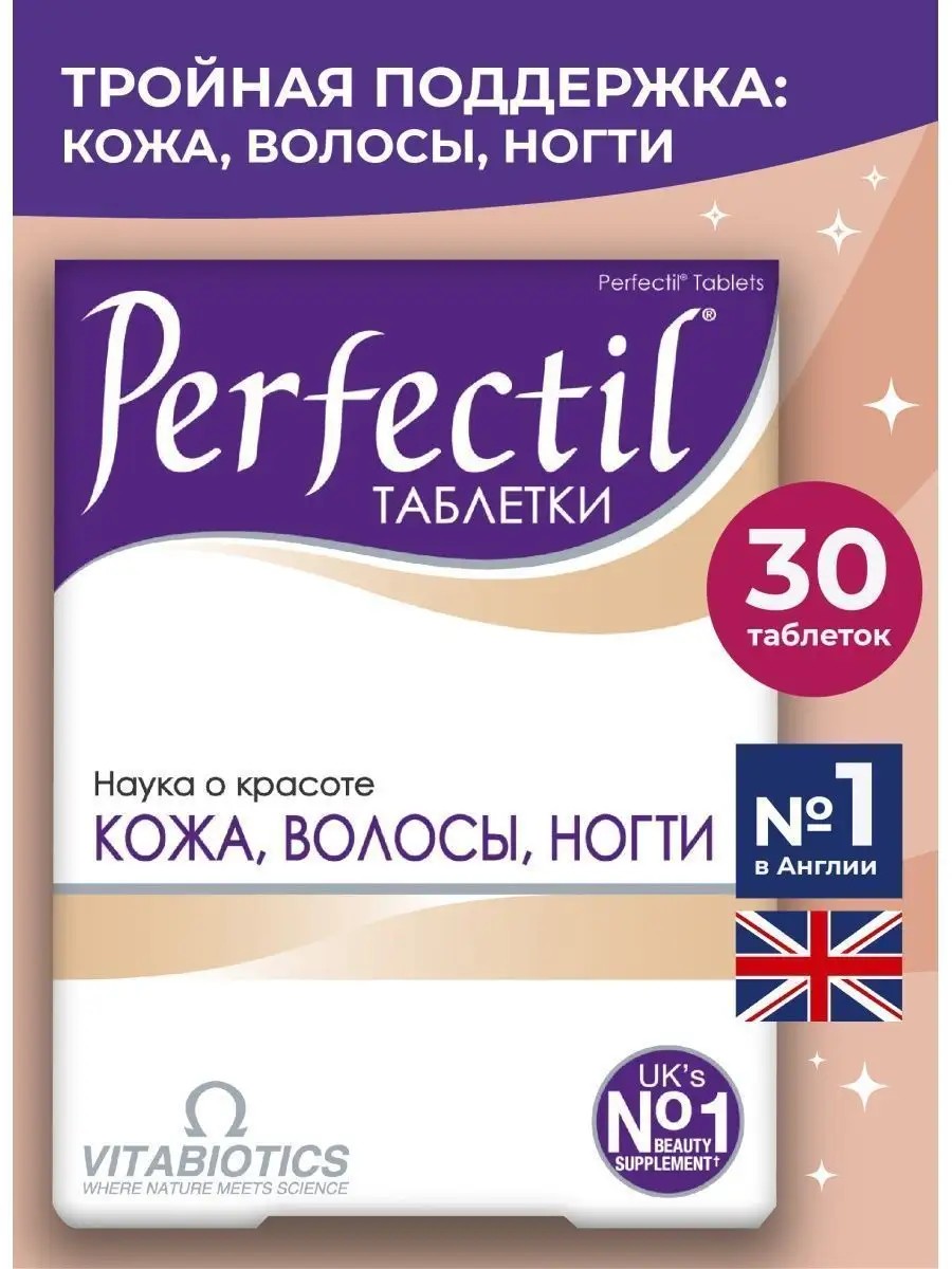 Уникальная формула витаминов для женщин, которые питают и поддерживают красоту волос, кожи и ногтей. Мультивитамины для женщин Перфектил созданы для обеспечения "красоты изнутри" и предназначены для ежедневного ухода. Витамины группы В (В1, В2, В3, В6, В12), витамин Д (Д3) и Биотин повышают эластичность кожи, питают и выравнивают тон. Женские витамины для волос от выпадения: Цинк витамины, железо витамины, Селен, витамины а е стимулируют рост волос, помогают от выпадения волос у женщин, укрепляют ногти, способствуют восстановлению структуры волос. Витамины для кожи: экстракт виноградных косточек, L-цистин, витамин С для лица способствуют выработке коллагена (collagen). Витаминный комплекс содержит микронутриенты, отвечающие потребностям в питании кожи, волос и ногтей. Витаминный комплекс для женщин Perfectil разработан ведущими специалистами Великобритании. Витамины подходят взрослым женщинам и девушкам. Рекомендуем витамины для женщин, витамины для девушек, бады для женщин, витамины и витаминные комплексы производителя Витабиотикс (Vitabiotics), витамины для волос, витамины для лица, витамины для ногтей, поливитамины для женщин. L