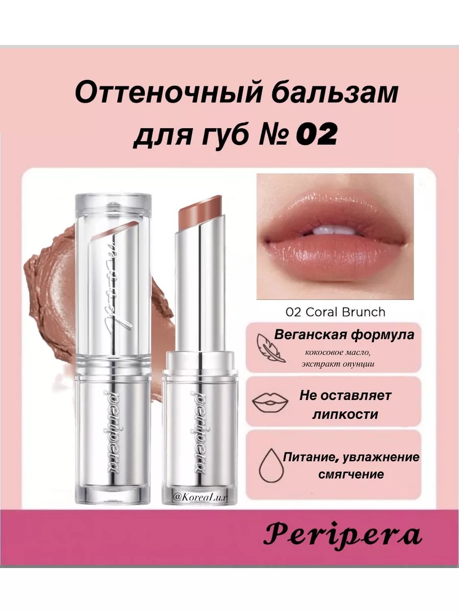 Peripera Ink Mood Glowy Balm No. 02 is a tinted lip balm that deeply moisturizes lips and is suitable for daily use. This vegan lip balm contains trehalose, coconut oil, and prickly pear extract. This treatment for dry lips softens and nourishes the skin, keeping it hydrated all day long. The smooth and softening texture of this tinted balm applies easily and leaves a dewy finish. Contains squalane, camellia, apple seed, and coconut oils, and while it doesn't dry out lips or accentuate cracks or peeling, it moisturizes and leaves lips with a soft, glossy shine, making them appear fuller, more attractive, and more luscious. This product maintains optimal moisture levels, nourishes and restores the skin, reduces flaking and dryness, and protects from the sun, wind, and cold. This melting lipstick contains only high-quality pigments. The lipstick comes in a convenient stick format in a stylish silver case. Lipstick and lip balm shades: No. 01 Pink Genre: a romantic, pure pink. No. 02 Coral Brunch: a sunny, warm coral. No. 03 Rose Thought: a pink color.