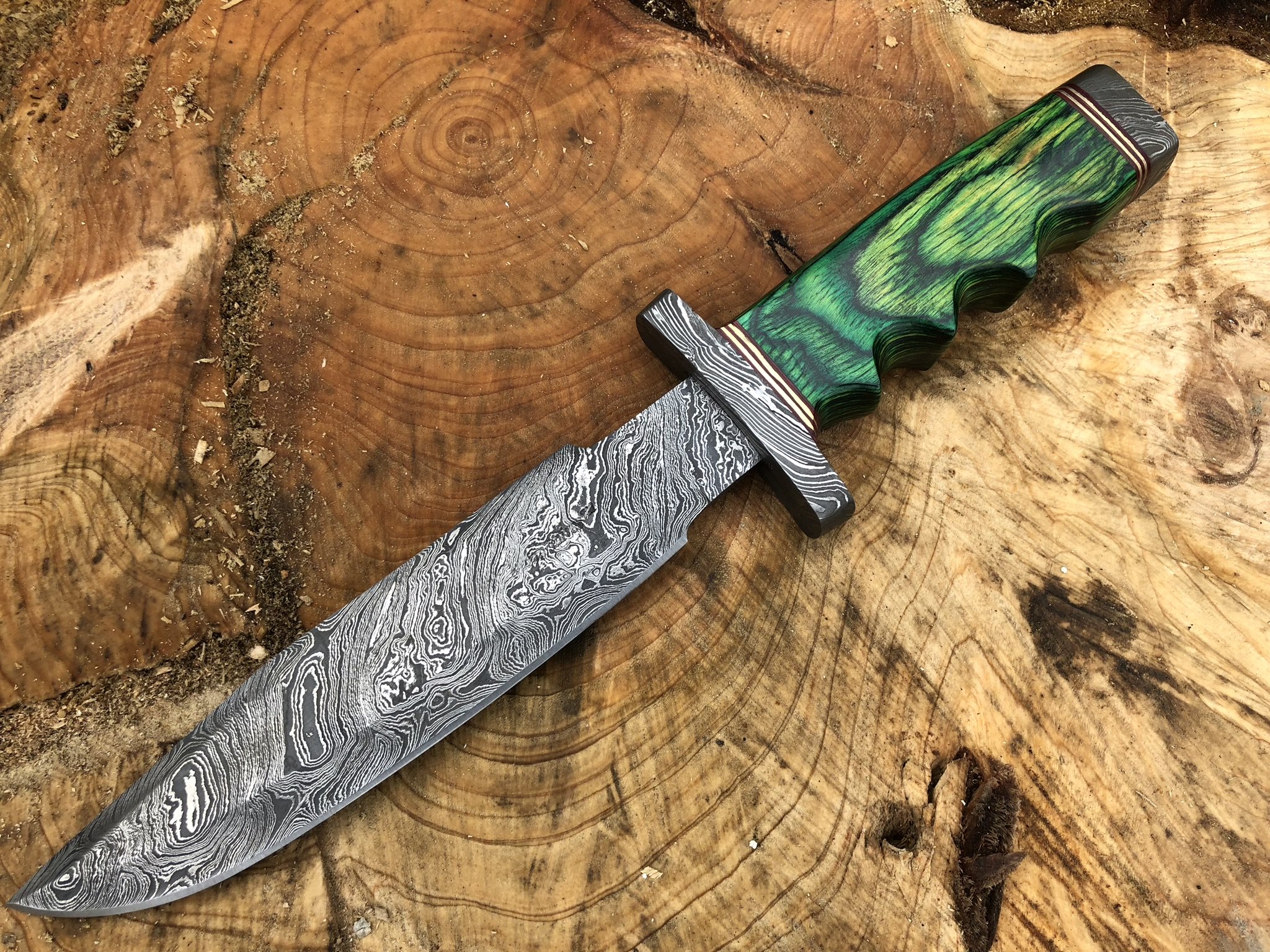 Perkin Knives Damastmesser Jagdmesser mit Scheide - Jagdmesser Bowie (Grüner Holzgriff und Damast)