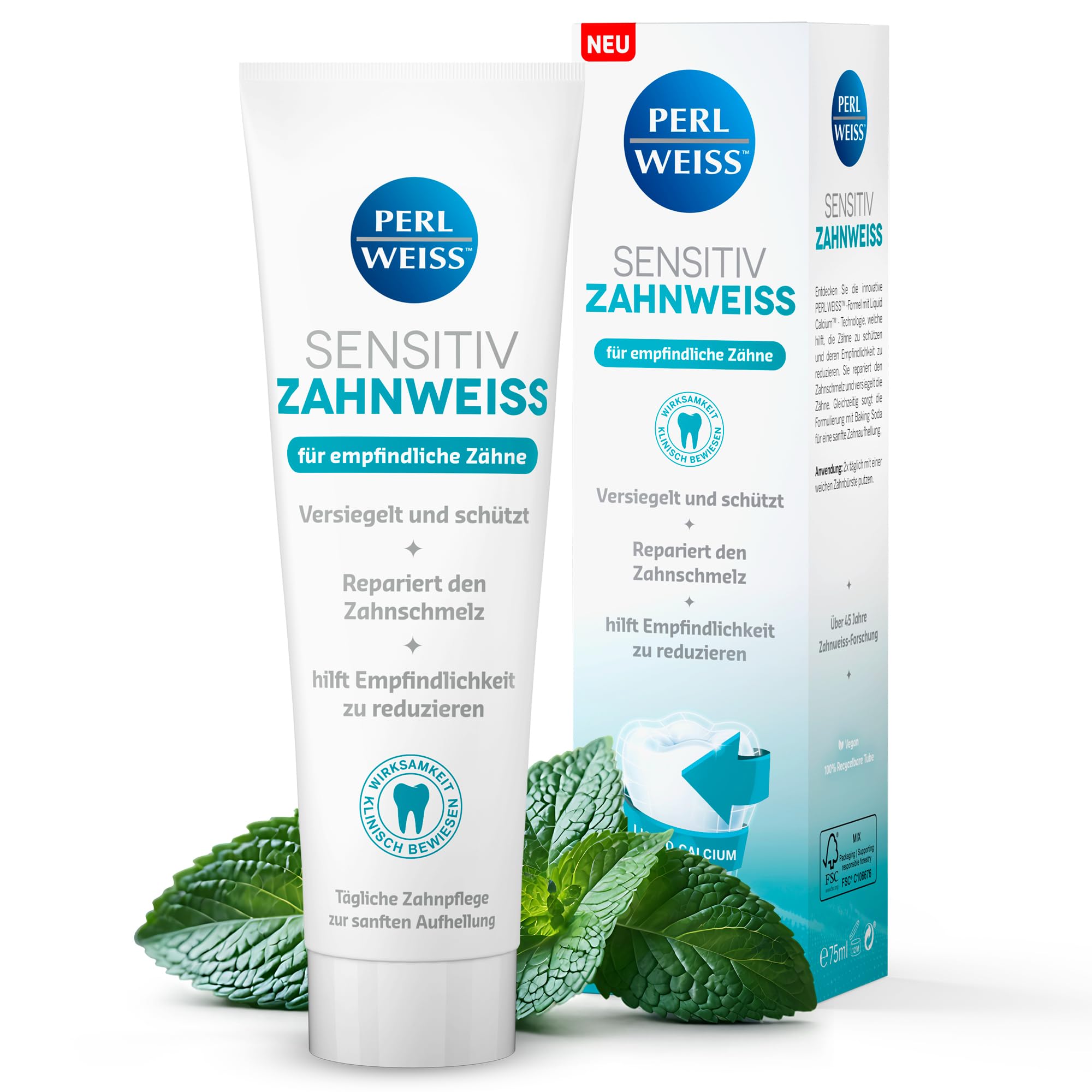 Pearl White Sensitiv - Gentle care for sensitive teeth. The innovative Liquid Calcium™ technology helps repair enamel and strengthens teeth from within. Its gentle formula removes stains without damaging enamel and significantly reduces sensitivity and pain. Perfect for everyday use – for a bright, healthy smile! DIRECTIONS FOR USE Apply a small amount of Pearl White Sensitiv to your toothbrush and brush thoroughly for at least 2 minutes. Then rinse well with water. Use Perlweiss Sensitiv Teeth Whitener every day to strengthen your teeth and ensure lasting freshness and cleanliness. SAFETY WARNING For external use only. Do not swallow. Keep out of reach of children. If irritation occurs, discontinue use and consult a dentist. See more