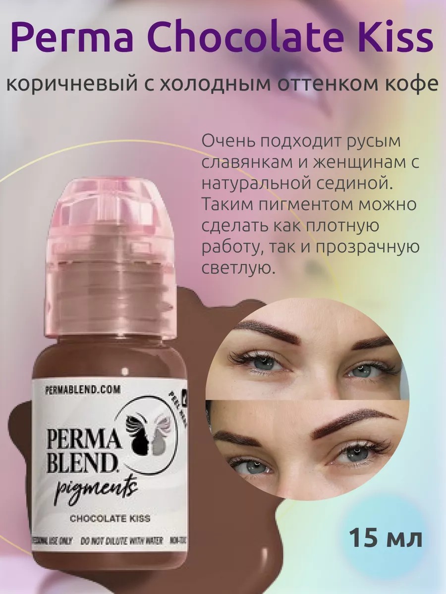 Для коррекции при жирности кожи в "Chocolate Kiss" можно ввести теплый пигмент из бровной палитры Perma Blend и корректор, что позволит добиться идеального баланса оттенка. Этот пигмент применяется для получения серо-коричневого цвета бровей с возможностью варьирования от умеренного до темного оттенка, делая его универсальным выбором для многих типов внешности.