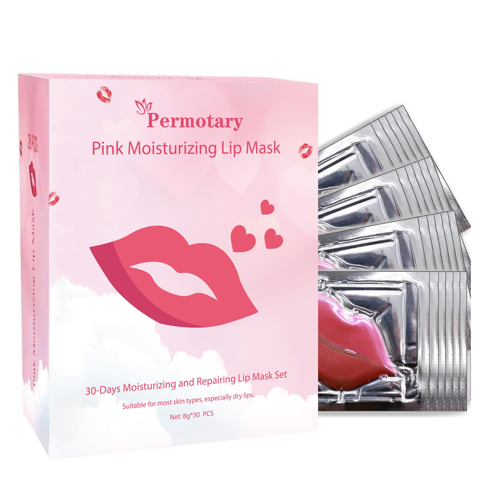 Permotary 30 PCS Collagen Lip Mask Crystal Lip Care Gel Pads for Moisturizing & Reducing Chapped, Smoothing Fine Lines-Mouth Patches for Firms & Hydrate and Plump 30 PCS Boxed-Pink