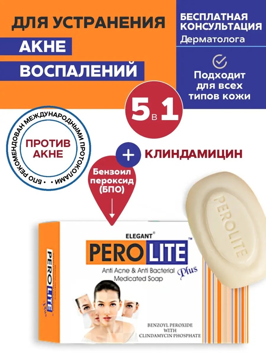 Мыло от акне ПЕРОЛАЙТ ПЛЮС - единственное в России твердое косметическое мыло от прыщей и угрей, а также от черных точек, которое содержит сочетание двух мощных активных веществ, дающих отличный эффект при лечении акне. Мыло Perolite Plus подходит для тяжелых (2-4) степеней акне, особенно в рамках комплексной терапии. Это антибактериальное мыло для проблемной кожи, которое отлично очищает, уничтожает бактерии, вызывающие акне, и снимает воспаления, подсушивает прыщи и угри. Оказывает отшелушивающий эффект и сужает поры. Средство от акне, эффект от которой подтвержден международными исследованиями. Подходит для всех типов кожи, для мужчин и женщин. Применяется в домашних условиях. Можно купить без рецепта врача, однако консультация дерматолога желательна. Подходит не только для лица, но для всего тела. 75 грамм твердого мыла хватает на более длительный срок, чем гелей и кремов, что снижает стоимость курса избавления от акне.