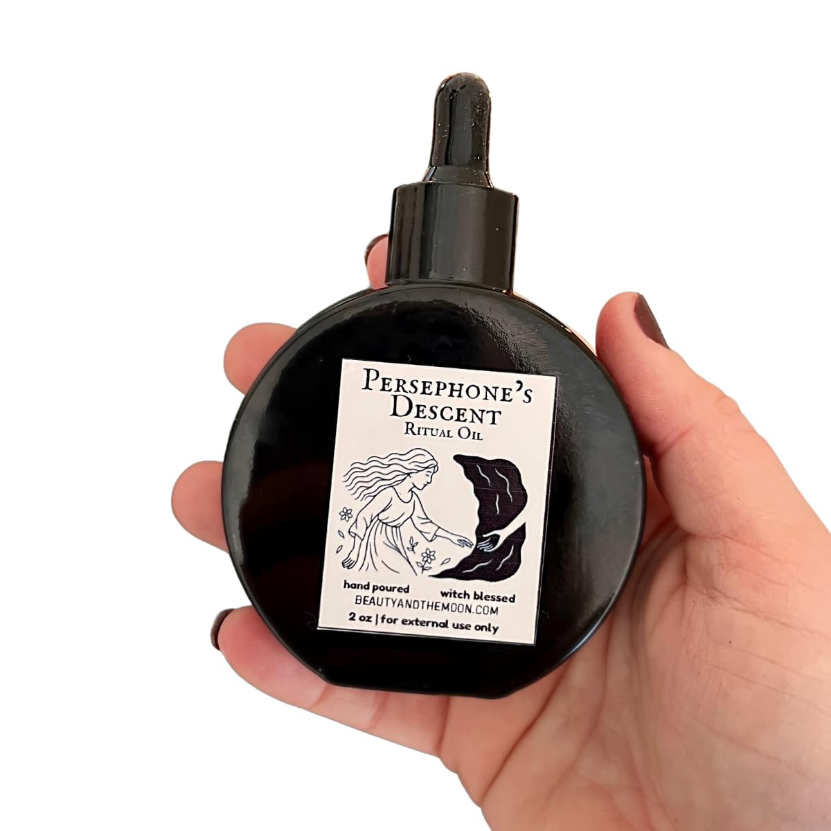 Infused with Intention Non-Toxic Eco-Friendly Woman Made Essential Oils and Natural Almond Jojoba Oil Only Hand Poured Made in the USA When I created Persephone's Descent, I wanted to capture the quiet power of turning inward, that sacred moment between light and shadow. Inspired by the Queen of the Underworld, this ritual oil embodies her journey from light to darkness, innocence to sovereignty, and descent to renewal. It honors the cycles within us all, the moments when we must surrender to the dark to be reborn anew. Blended with pure almond and jojoba oils, it nourishes even sensitive skin while leaving a smooth, radiant finish. Scented only with pure natural essential oils- rose, vanilla, juniper berry, and a hint of black pepper- the fragrance is floral yet grounding, a balance of sweetness and shadow that mirrors Persephone herself. Each 2 oz black glass bottle comes tucked in a beautiful velvet bag with directions for use, making it a thoughtful gift or sacred addition to your own altar. Use this oil to anoint candles, ritual tools, or yourself before meditation, shadow work, or seasonal rites. It can also be worn as a ritual perfume or added to bathwater to invoke Persephone's transformative energy. Persephone's Descent invites you to move gracefully through your own seasons of change, finding beauty in stillness, strength in surrender, and rebirth in every return.
