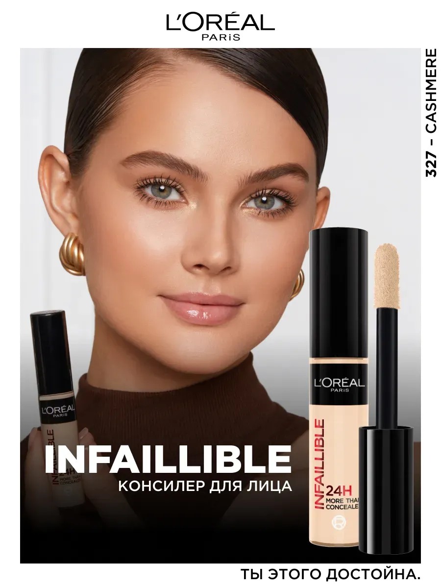 It's more than a concealer: longer lasting, more coverage, and more volume. The long-lasting, multi-functional concealer INFAILLIBLE from L'Oreal Paris is suitable for both visibly evening out skin tone under the eyes and for targeted correction of skin imperfections. HOW TO USE: Apply to the desired areas of the face with the applicator, blend with your fingertips or a sponge. Pairs perfectly with long-lasting foundations and powders from the INFAILLIBLE series. Avoid contact with eyes. In case of contact, rinse thoroughly with water. Highly pigmented and flexible formula. 24-hour super-long-lasting coverage. Matte result.