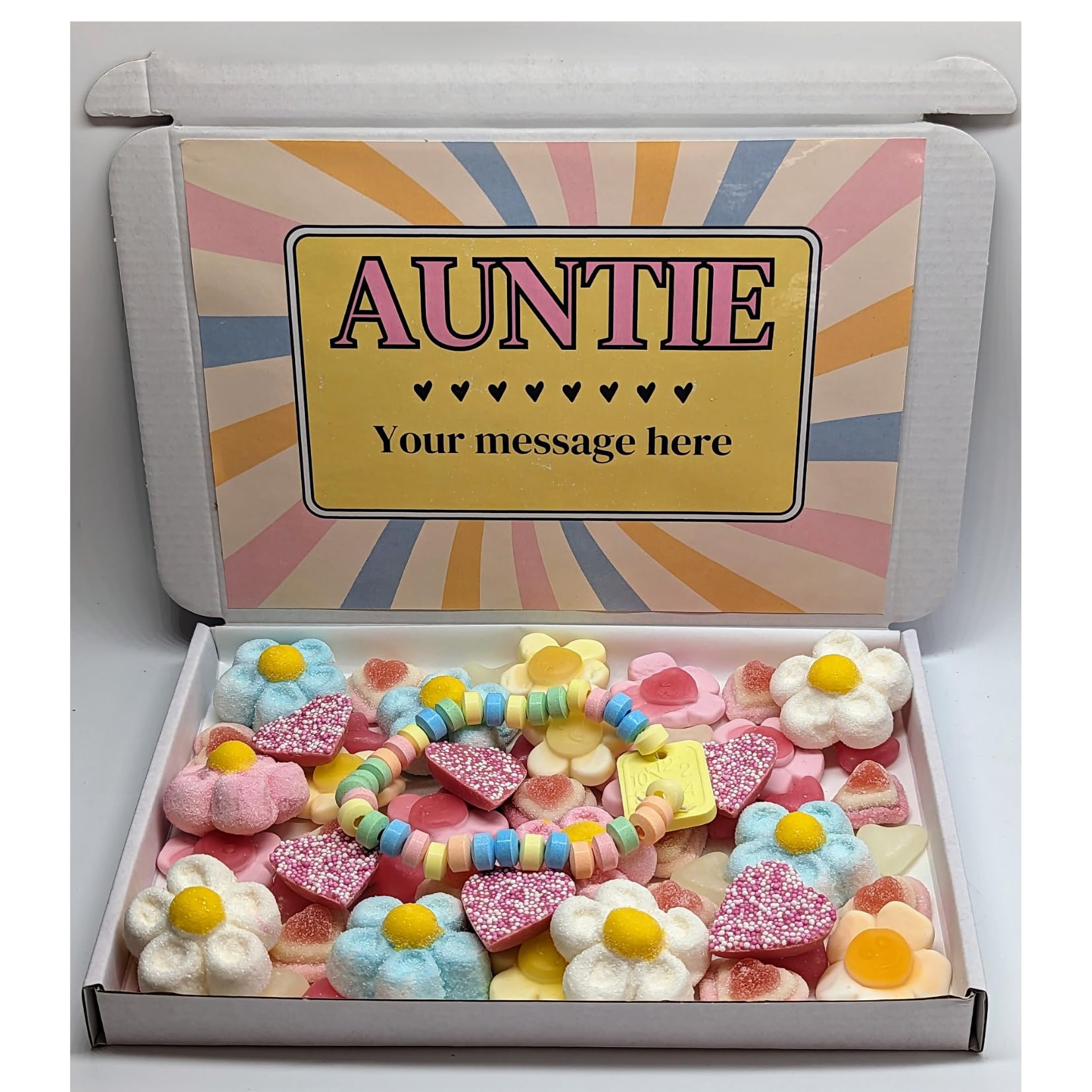 Personalised Auntie sweet box Auntie sweet box Auntie Auntie birthday Auntie gift Happy birthday Aunt Aunty This personalised sweet box is the perfect gift for any occasion, especially for an Auntie's birthday. The box includes a variety of gummy, soft sweets, and marshmallows. You can personalise the box by choosing the text that will be printed on the inside. The 450G box is filled with delicious sweets that will satisfy any sweet tooth. With its cute packaging and tasty contents, this sweet box is sure to bring a smile to your Auntie's face.
