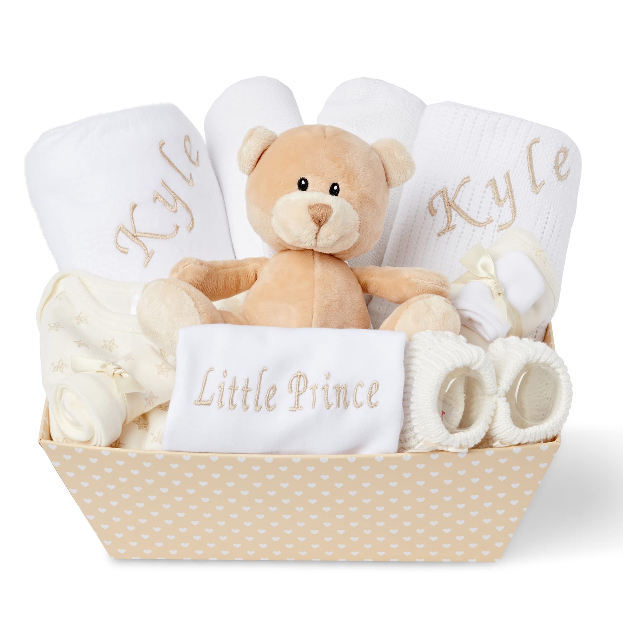 BUY WITH CONFIDENCE - At Baby Box Shop we bring together and create every baby hamper basket or baby gift set here in the UK. All our products are carefully boxed so they arrive in perfect condition. If there is any issue at all with your order, we promise to do everything we can to make it right. All soft toys are European Safety Standard Tested (EN71) suitable from birth. MAKING THE RIGHT CHOICE - Finding the right present for a new baby can be a difficult task because of the wide choice available. Baby Box Shop offers you a value for money option in this thoughtfully arranged baby gift set. VALUE FOR MONEY - Once all the new baby essentials gifts have been taken out and used, it becomes a great little storage box. This adds value because it can be used to keep and save all those little keepsakes like cards, records, toys etc. to be taken out and enjoyed in the future. If you're looking for pregnancy gifts this full personalised baby hamper keepsake box makes an ideal maternity leaving present. BABY HAMPER - You will not be disappointed at the quality of baby clothes. Includes 2 personalized gifts, an embossed fleece blanket, a cotton blanket and a white bodysuit embroidered with Little Prince. Additional gifts include a teddy bear soft toy, 2 x muslins, patterned bodysuit, bib, mittens, hat and booties. All baby clothes in our gift sets are sized in 3-6 months. BABY SHOWER GIFTS - Imagine presenting these beautiful gifts for a new baby to the new parents and their excitement when they open the lid and see the personalised new baby gifts collection inside. Package Dimensions: 31 x 24 x 19.5 cm.